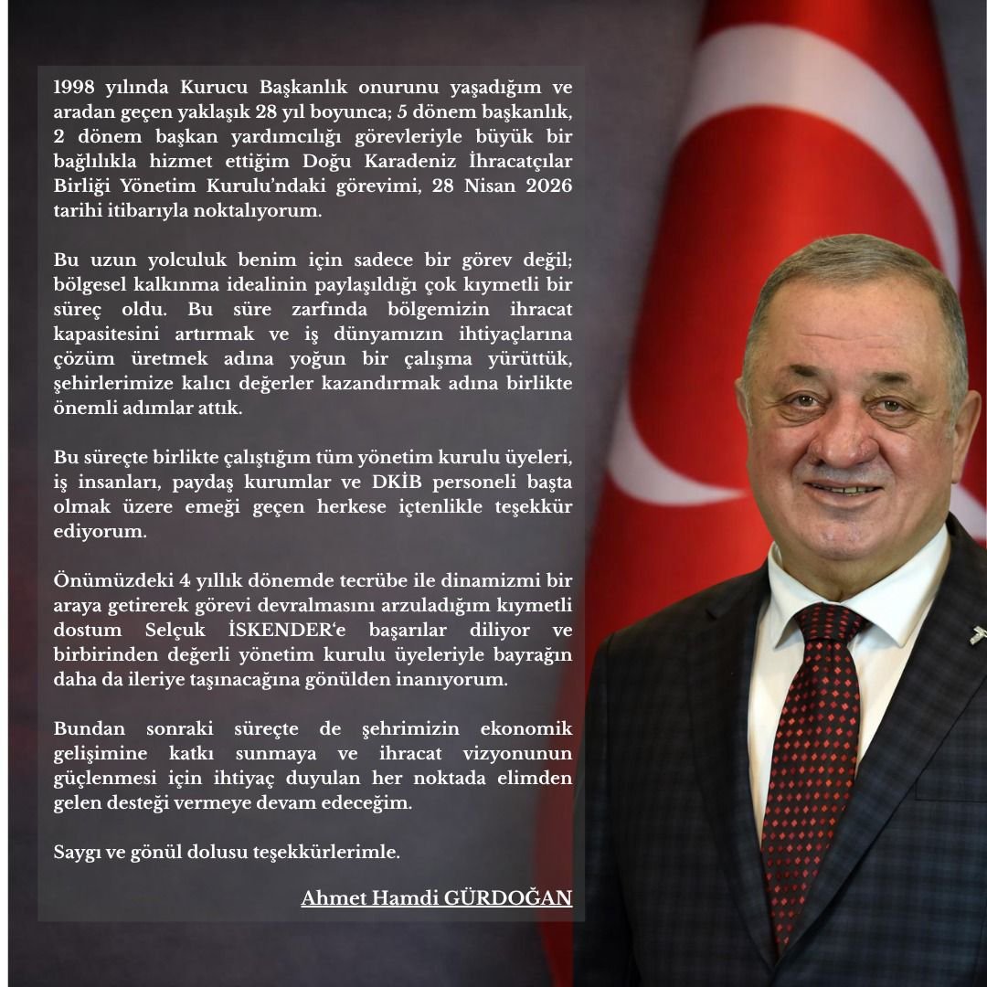Doğu Karadeniz İhracatçılar Birliği Yönetim Kurulu Başkan Yardımcısı Ahmet Hamdi Gürdoğan, 1998 yılında başladığı ve yaklaşık 28 yıldır sürdürdüğü görevini 28 Nisan 2026 tarihi itibarıyla noktalayacağını duyurdu.