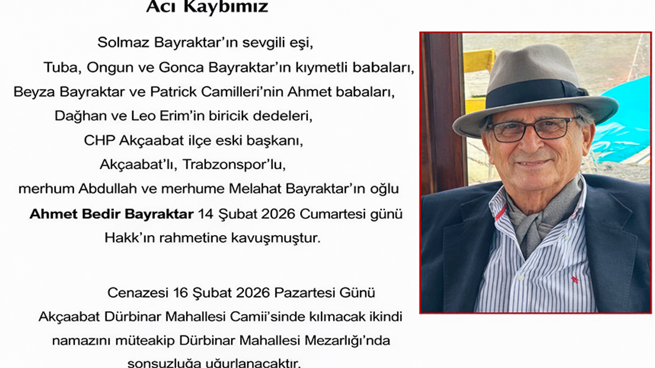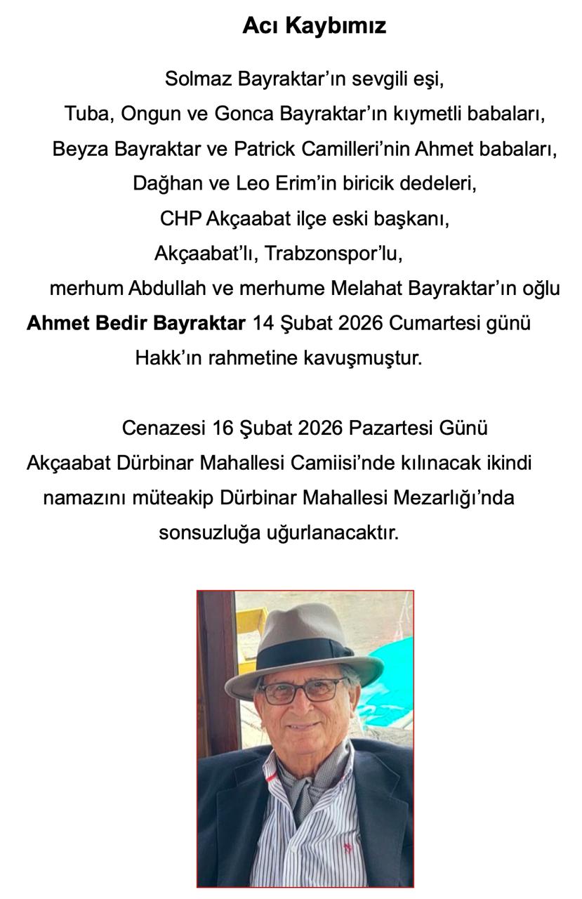 Cenaze Namazı 16 Şubat 2026 Pazartesi Günü İkindi Namazına Müteakip Akçaabat Mezarlık Camiinde Kılındıktan Sonra Aynı Yerdeki Aile Kabristanlığına Defnedilecek....