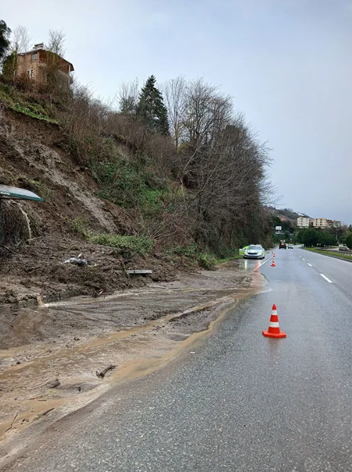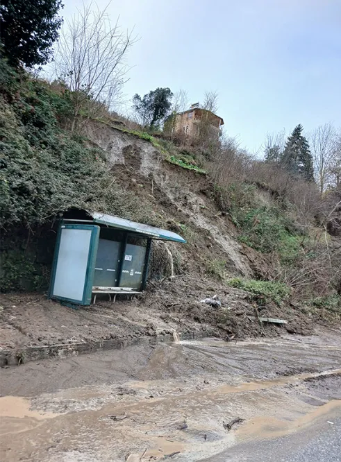 Akçaabat’ta aralıklarla etkisini sürdüren sağanak yağış, Akçakale Mahallesi’nde toprak kaymasına neden oldu. Yamaçtan kopan toprak ve çamur, yol kenarına kadar inerken, bir otobüs durağı zarar gördü. Heyelan nedeniyle yolun bir şeridi çamurla kaplandı.