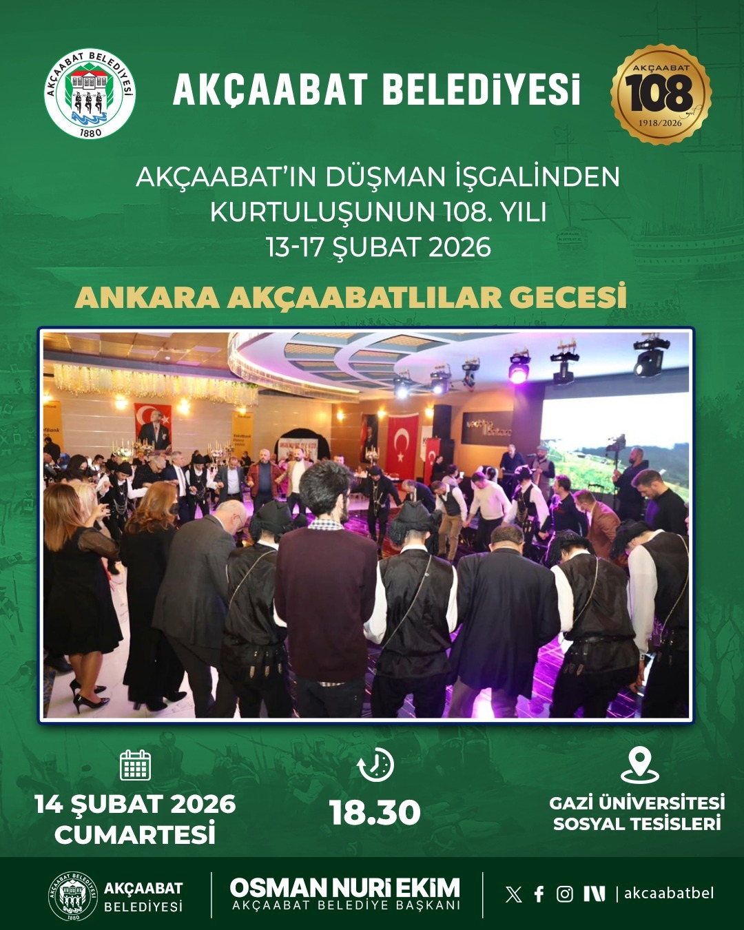 14 Şubat Cumartesi günü Ankara’da düzenlenecek Akçaabatlılar Gecesi ile hemşehrilerimiz bir araya gelirken, 14–15 Şubat tarihlerinde Akçaabat Belediyesi Yarı Olimpik Yüzme Havuzu’nda 18 yaş üstü yüzme yarışmaları gerçekleştirilecek.