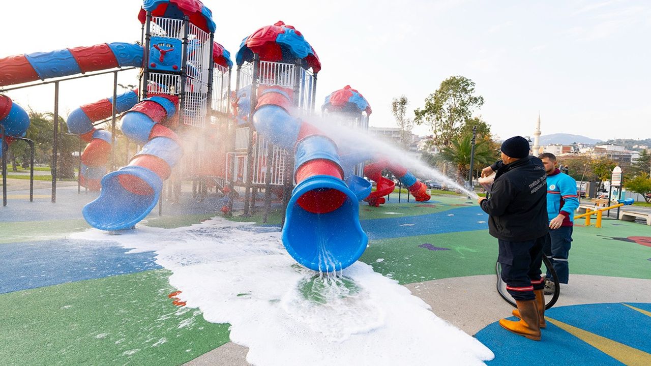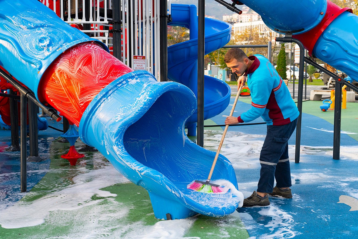 Belediye Temizlik İşleri Müdürlüğü ekipleri, sabahın erken saatlerinden itibaren mahalle mahalle dolaşarak parkların zeminlerini, oyun gruplarını, salıncak, kaydırak ve tahterevalli gibi ekipmanları özel temizlik malzemeleriyle yıkadı. Parkların çevre düzeni de elden geçirilerek çöpler toplandı, oturma alanları ve banklar dezenfekte edildi.