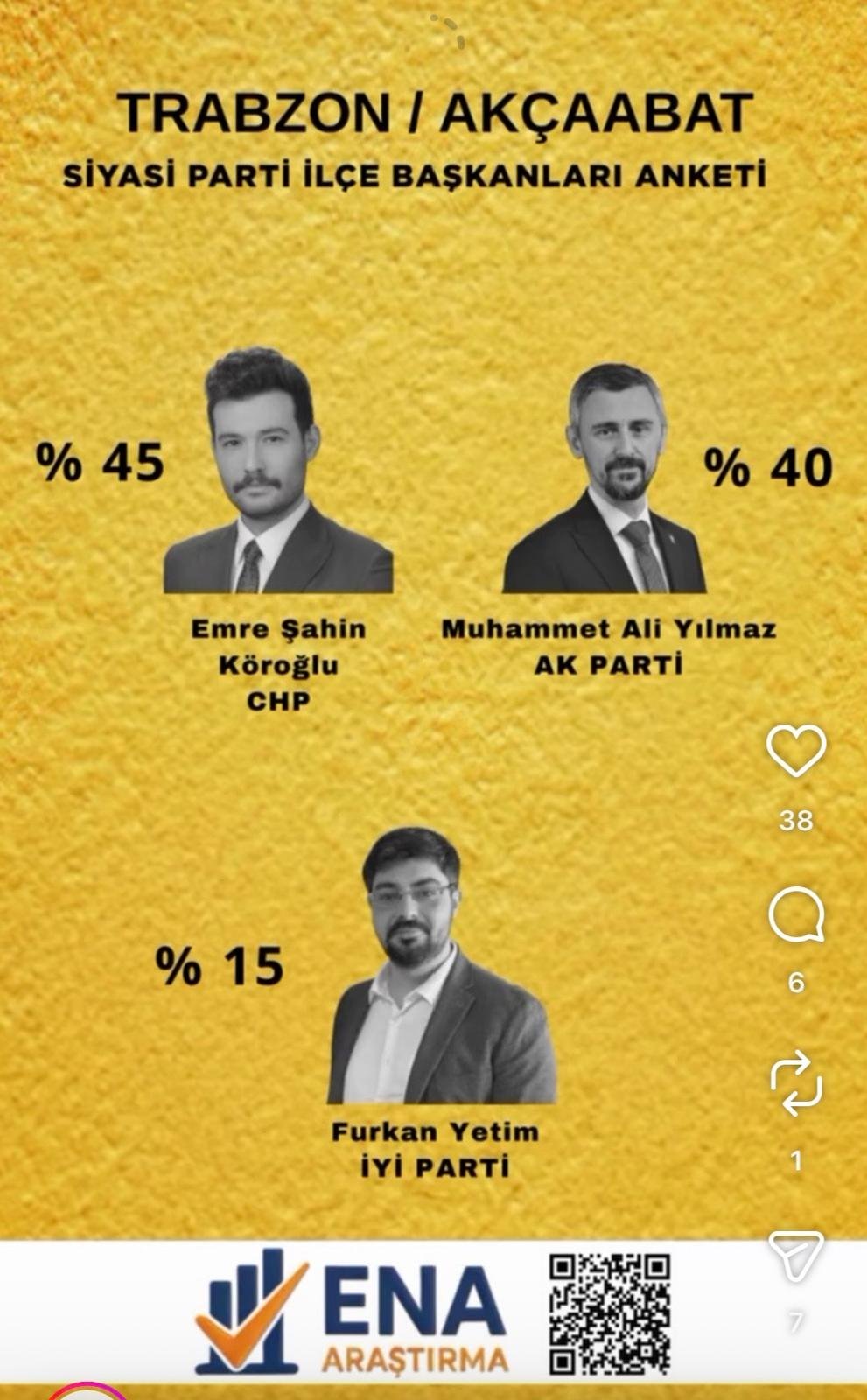 Ankette üçüncü sırada ise yüzde 15’lik oranla İYİ Parti İlçe Başkanı Furkan Yetim bulunuyor.