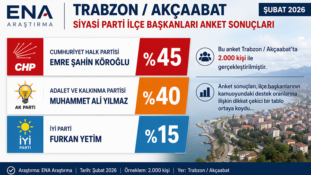 Trabzon’un Akçaabat ilçesinde gerçekleştirilen son kamuoyu araştırması, siyasi partilerin ilçe başkanlarına yönelik destek oranlarını ortaya koydu. ENA Araştırma tarafından Şubat 2026’da yapılan ankete göre, ilçede dikkat çeken bir tablo oluştu.