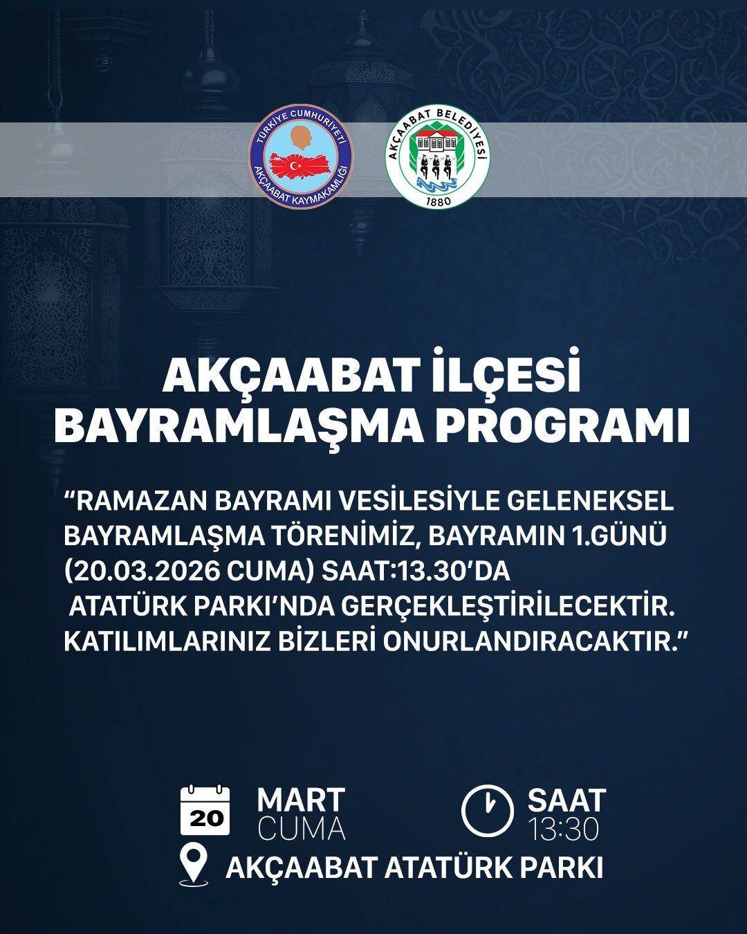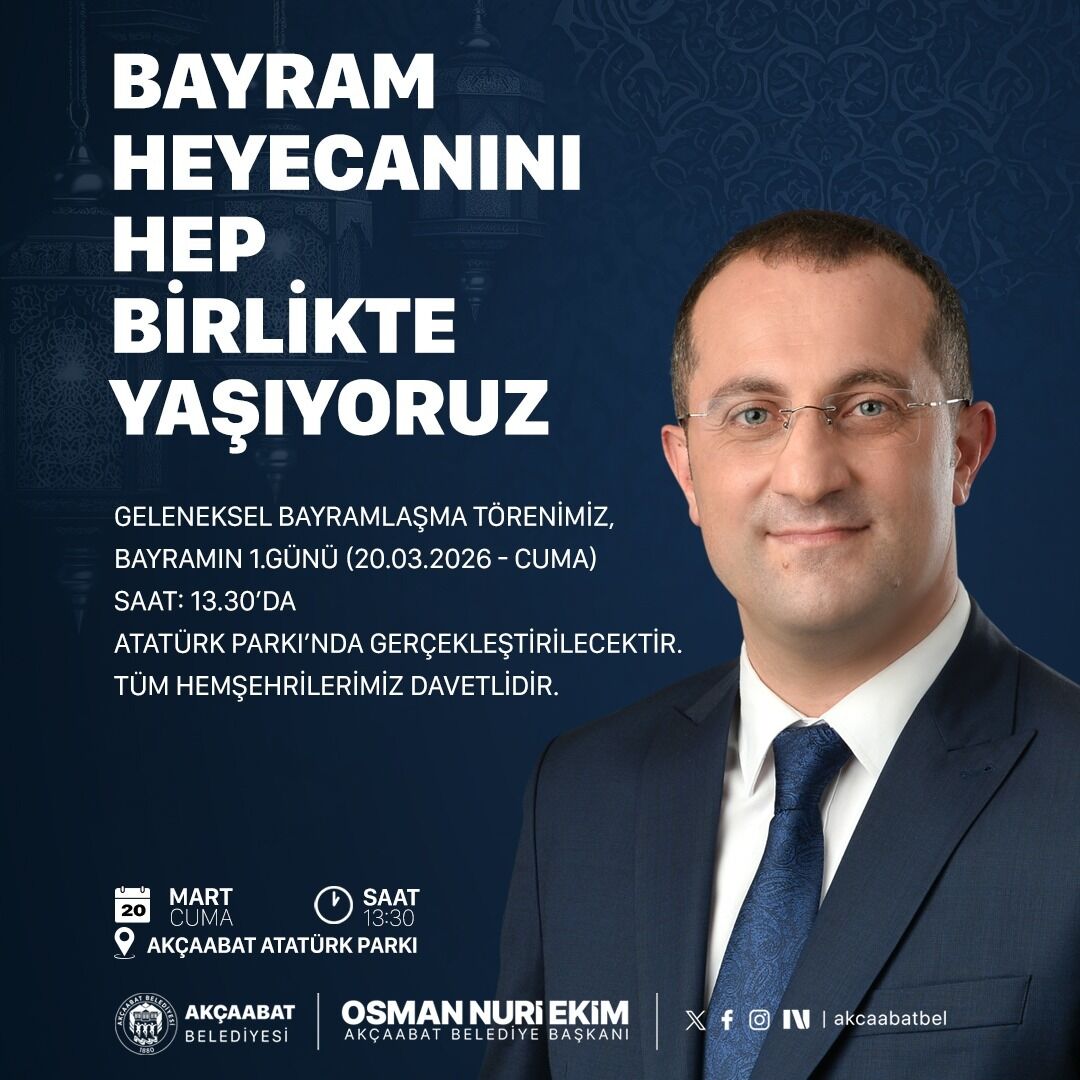“Bayramın coşkusunu ve kardeşlik iklimini birlikte yaşamak üzere tüm kıymetli hemşehrilerimizi bayramlaşma programımıza davet ediyorum. Gelin, bayram sevincini hep birlikte paylaşalım, Akçaabat’ımızda birlik ve beraberliğimizi daha da güçlendirelim.”