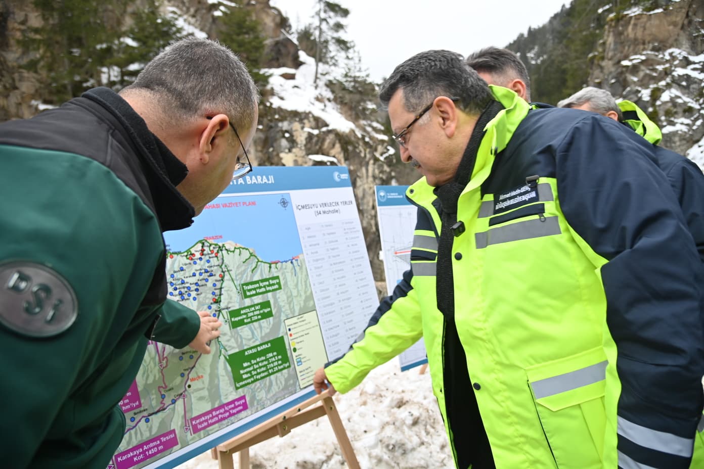 Büyükşehir Belediye Başkanı Ahmet Metin Genç ve DSİ Genel Müdürü Mehmet Akif Balta, barajın aks yerinde incelemelerde bulunup proje çalışmaları hakkında DSİ görevlilerinden bilgi aldı.