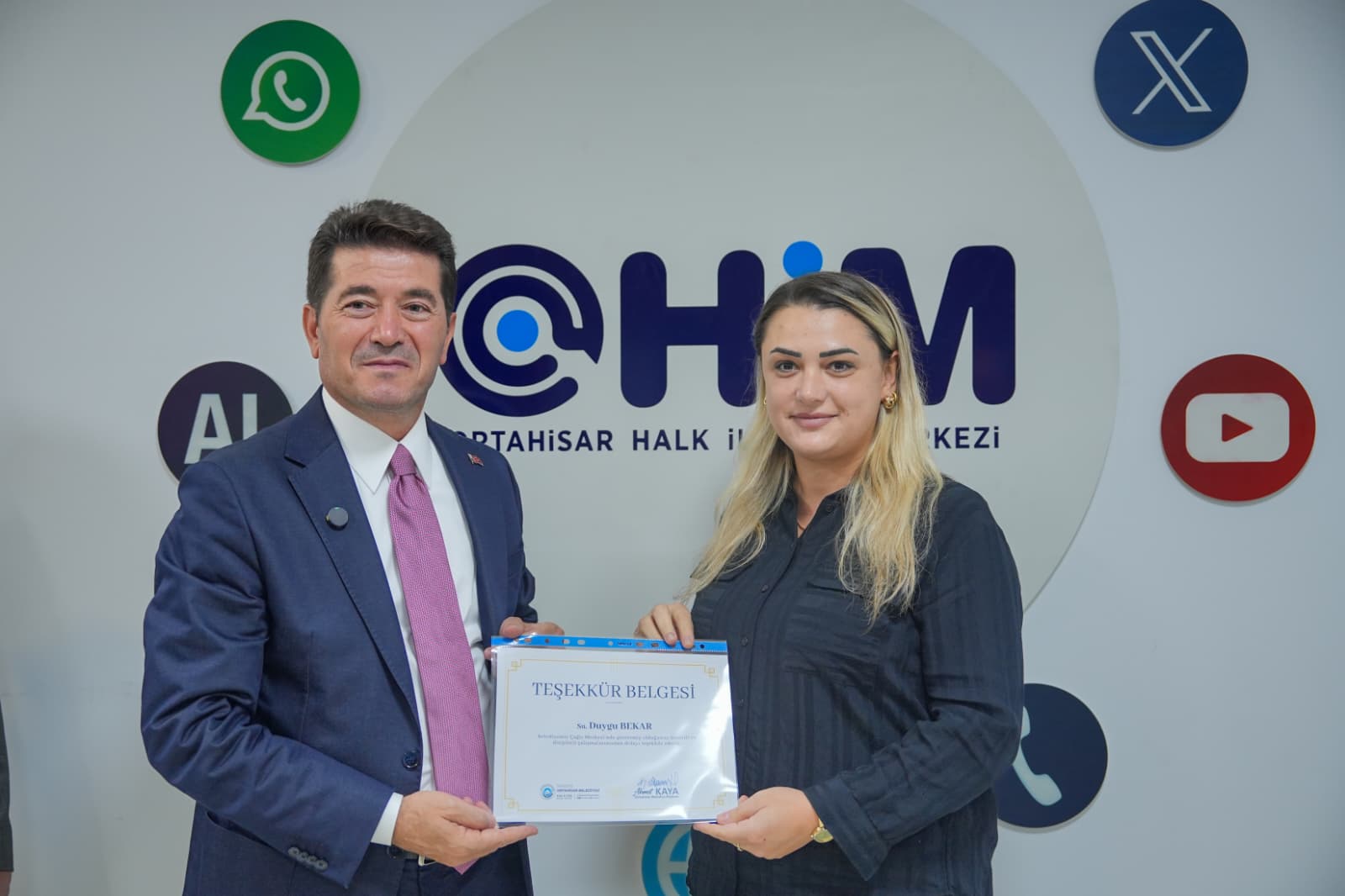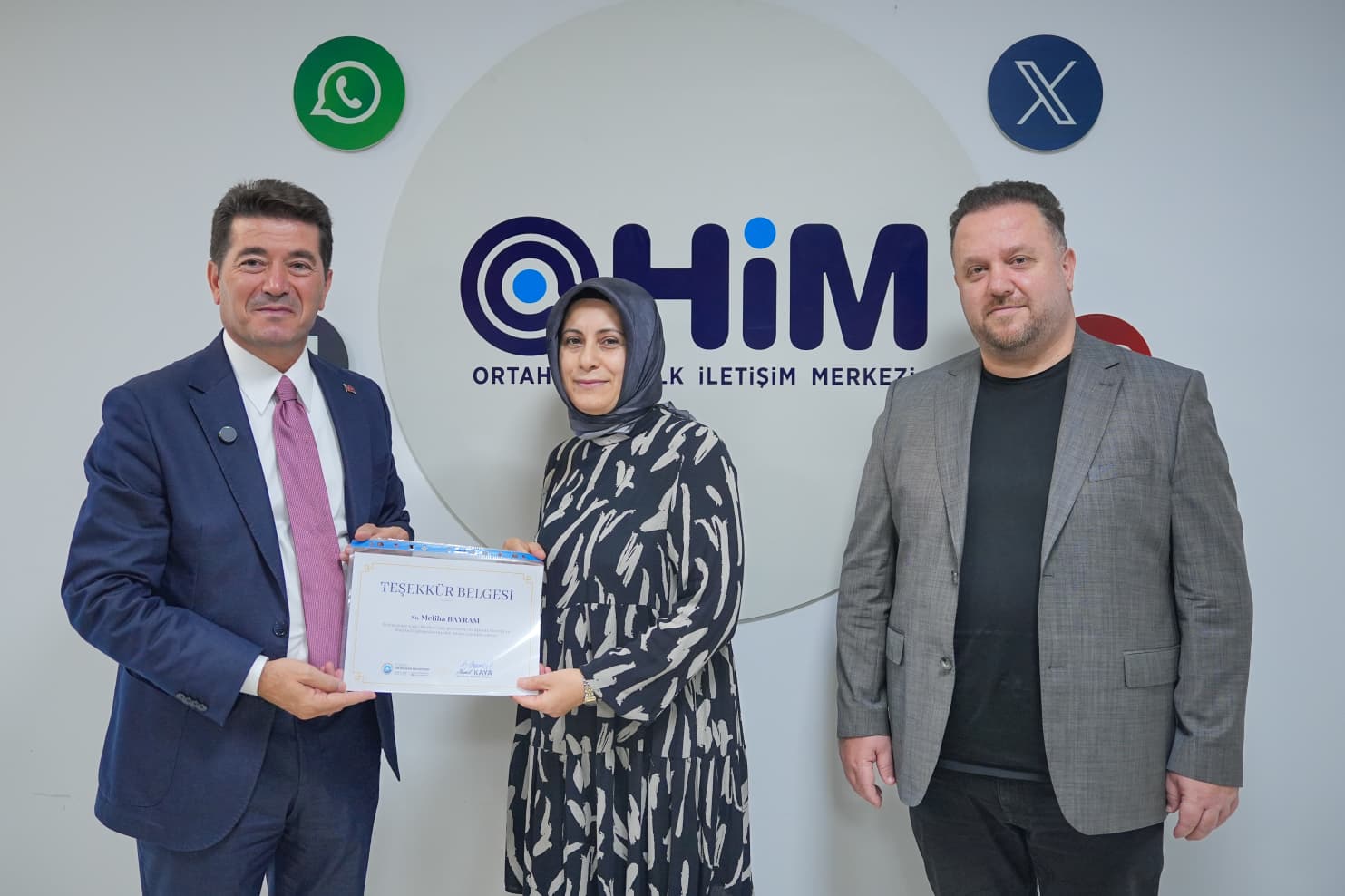 OHİM çalışanlarına teşekkür belgesi veren Başkan Kaya, “Gerçekten çok önemli bir görev üstleniyorsunuz. Arayan insanların ruh hali farklı olabiliyor ama siz hizmet bilinciyle vatandaşların sorunlarına çözüm üretmeye çalışıyorsunuz. Emeklerinize sağlık. Hepinize çok teşekkür ediyorum, kolaylıklar diliyorum” dedi.