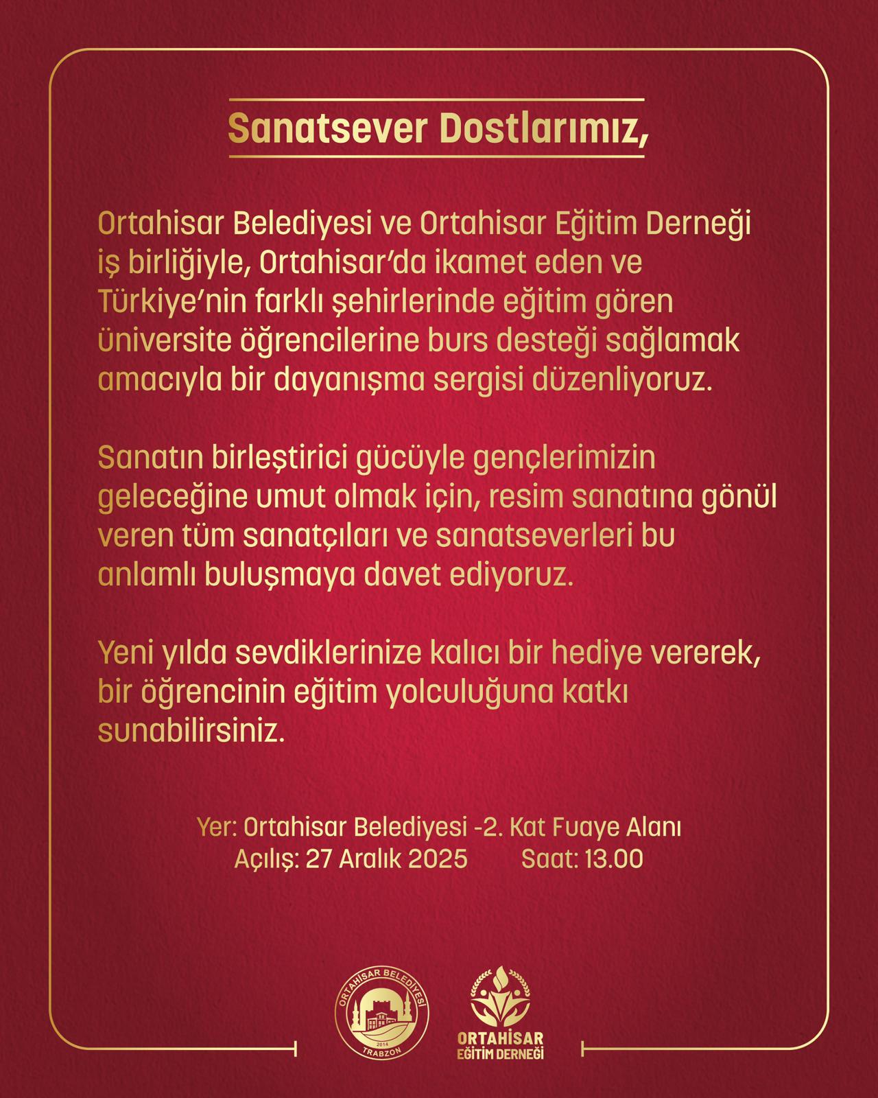 Ortahisar Belediyesi, Ortahisar Eğitim Derneği iş birliğiyle, üniversite öğrencilerine burs desteği sağlamak amacıyla bir resim sergisi düzenliyor. Belediyenin -2. Kat Fuaye Alanı’nda sanatseverlerle buluşacak serginin açılışı, 27 Aralık 2025 Cumartesi günü saat 13.00’te gerçekleştirilecek.