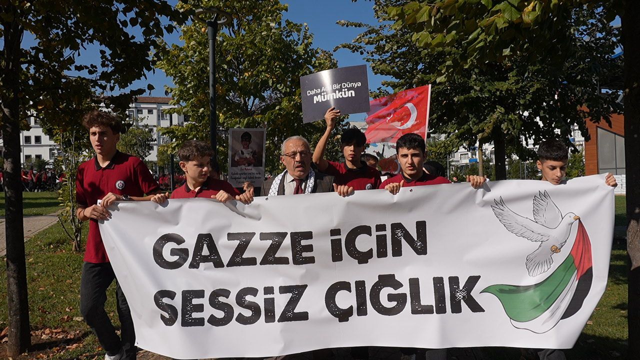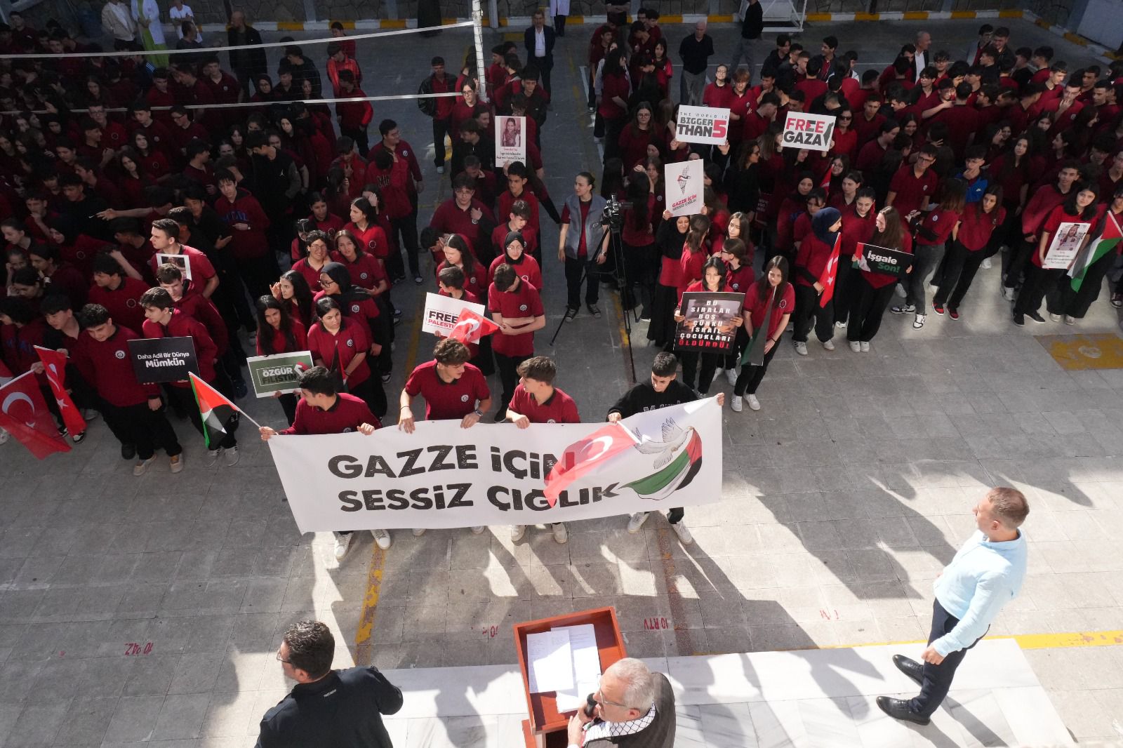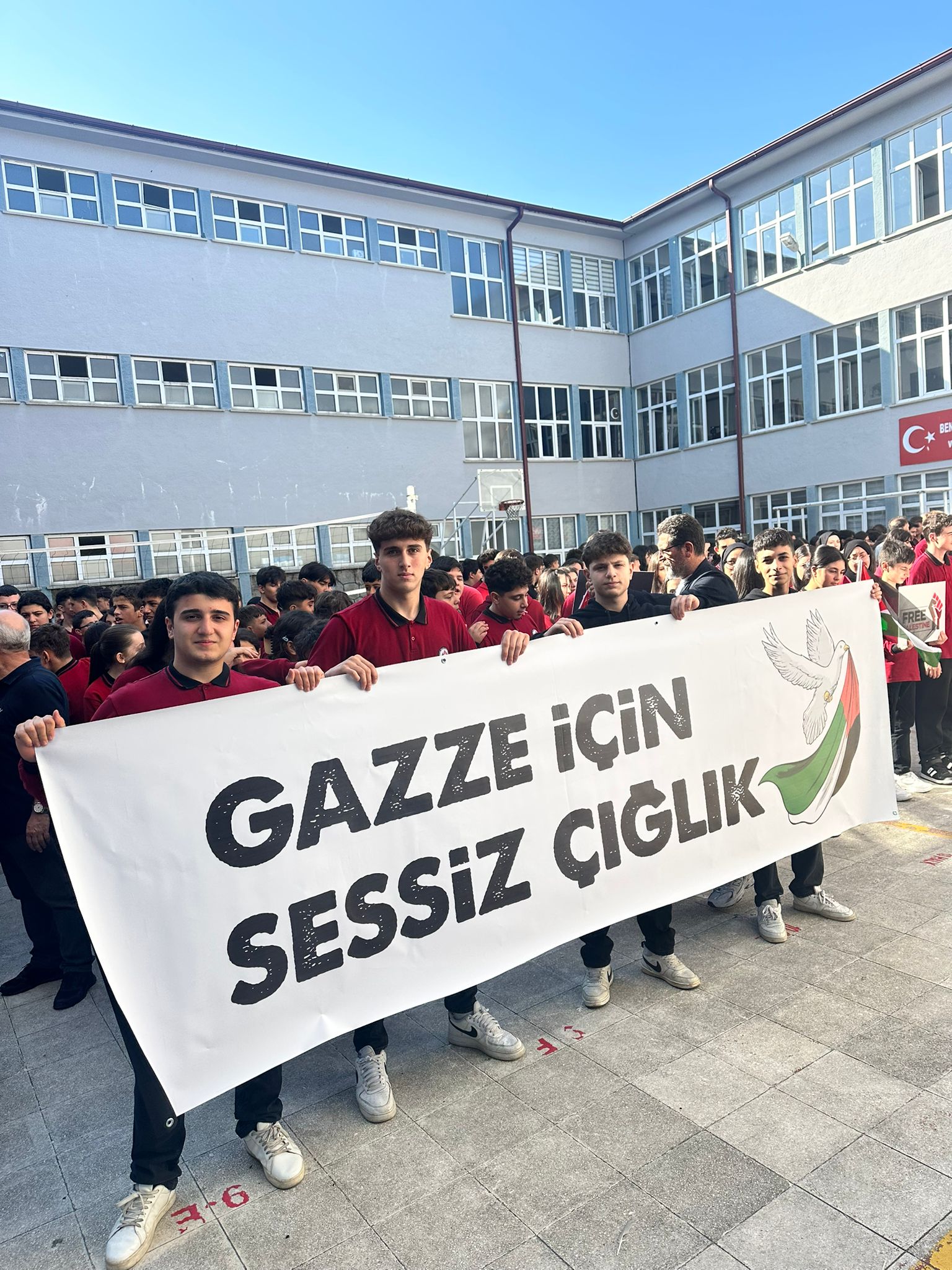 Kudüs 45 yıldır Siyonist çizmelerin işgali altında. Aslında yüzyıla varan bir işgalin parçasıdır bu. Emperyalistlerin koruma kanatları altında Siyonist İsrail, Filistin’in önemli bir kısmını işgal ettikten sonra kutlu beldemiz Kudüs’ü de 1967 yılında işgal ederek esir etti.Herkes Filistin halkının bu işgale karşı nasıl bir mücadele verdiğini çok iyi biliyor. Yükseltilen intifada ateşinin nasıl tutuşturulduğunu, minik elleriyle taş atan çocukların Mescid-i Aksa’nın kurtuluşu için kanatlanan birer meleğe dönüştüğünü herkes çok iyi biliyor. Direnişin Filistin topraklarında nasıl boy verdiğini, Ahmed Yasinlerin, Abbas Musavilerin, Fethi Şikakilerin mücadeleyi nasıl omuzlayıp yükselttiğini herkes çok iyi biliyor.Bu soykirimda son 3 yılda 72500 kişi şehit oldu 183400 kişide yaralandı ayrıca 2 milyon Filistinli yurdundan edilmek isteniyor okulumuz olarak bu SESSİZ ÇIĞLIĞA destek olmak için okulumuz tüm bileşenleriyle böyle güzel bir etkinliğe imza attik.Okul müdürümüze kıymetli öğretmenlerimize ve sevgili öğrencilerimize teşekkür ediyoruz...Kahrolsun İsrail Yaşasın Özgür Filistin...