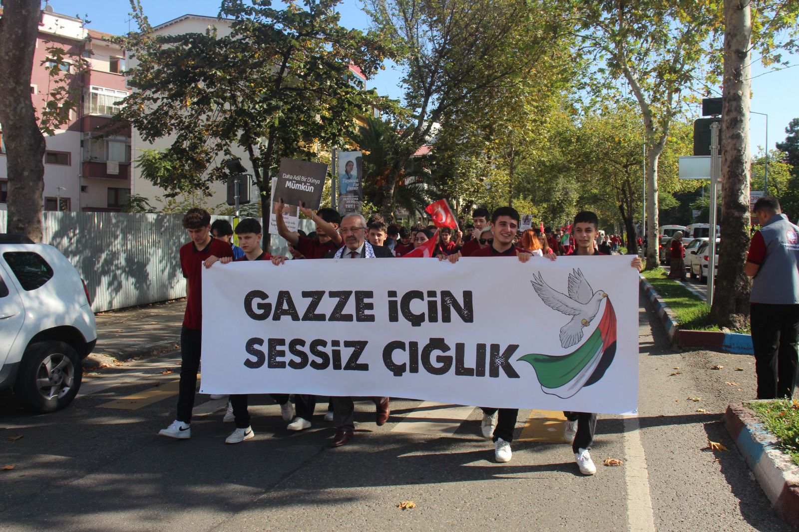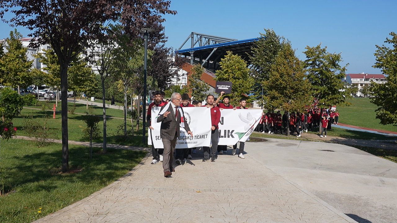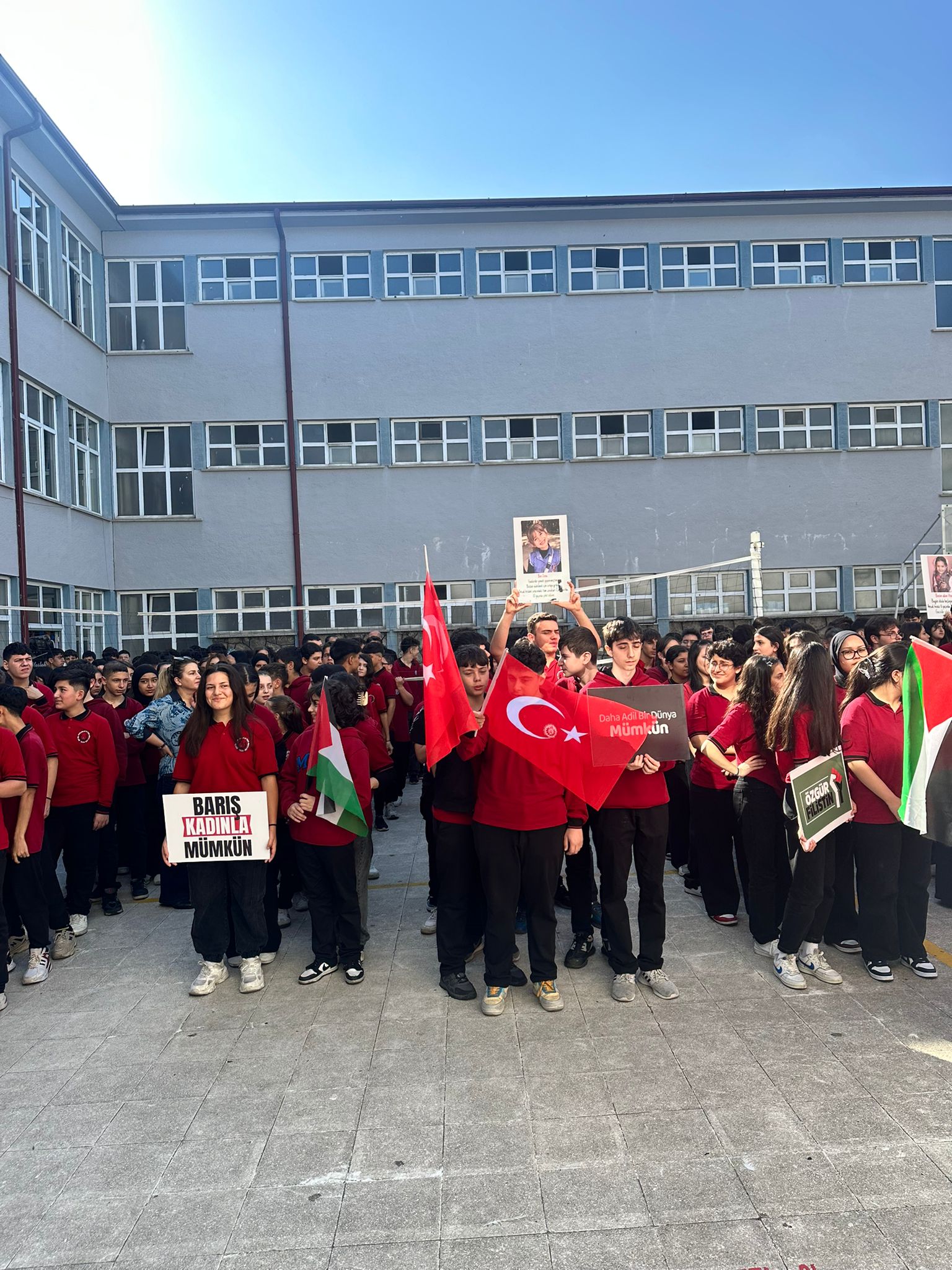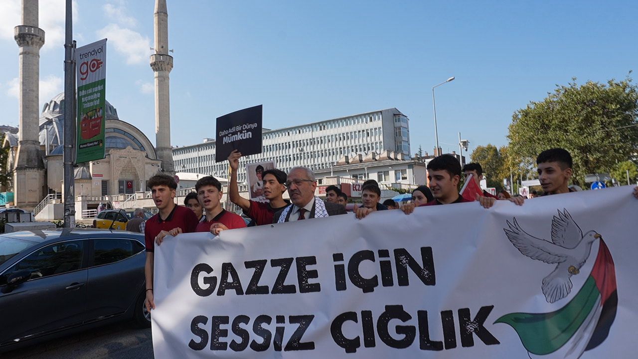 Kudüs 45 yıldır Siyonist çizmelerin işgali altında. Aslında yüzyıla varan bir işgalin parçasıdır bu. Emperyalistlerin koruma kanatları altında Siyonist İsrail, Filistin’in önemli bir kısmını işgal ettikten sonra kutlu beldemiz Kudüs’ü de 1967 yılında işgal ederek esir etti.Herkes Filistin halkının bu işgale karşı nasıl bir mücadele verdiğini çok iyi biliyor. Yükseltilen intifada ateşinin nasıl tutuşturulduğunu, minik elleriyle taş atan çocukların Mescid-i Aksa’nın kurtuluşu için kanatlanan birer meleğe dönüştüğünü herkes çok iyi biliyor. Direnişin Filistin topraklarında nasıl boy verdiğini, Ahmed Yasinlerin, Abbas Musavilerin, Fethi Şikakilerin mücadeleyi nasıl omuzlayıp yükselttiğini herkes çok iyi biliyor.Bu soykirimda son 3 yılda 72500 kişi şehit oldu 183400 kişide yaralandı ayrıca 2 milyon Filistinli yurdundan edilmek isteniyor okulumuz olarak bu SESSİZ ÇIĞLIĞA destek olmak için okulumuz tüm bileşenleriyle böyle güzel bir etkinliğe imza attik.Okul müdürümüze kıymetli öğretmenlerimize ve sevgili öğrencilerimize teşekkür ediyoruz...Kahrolsun İsrail Yaşasın Özgür Filistin...