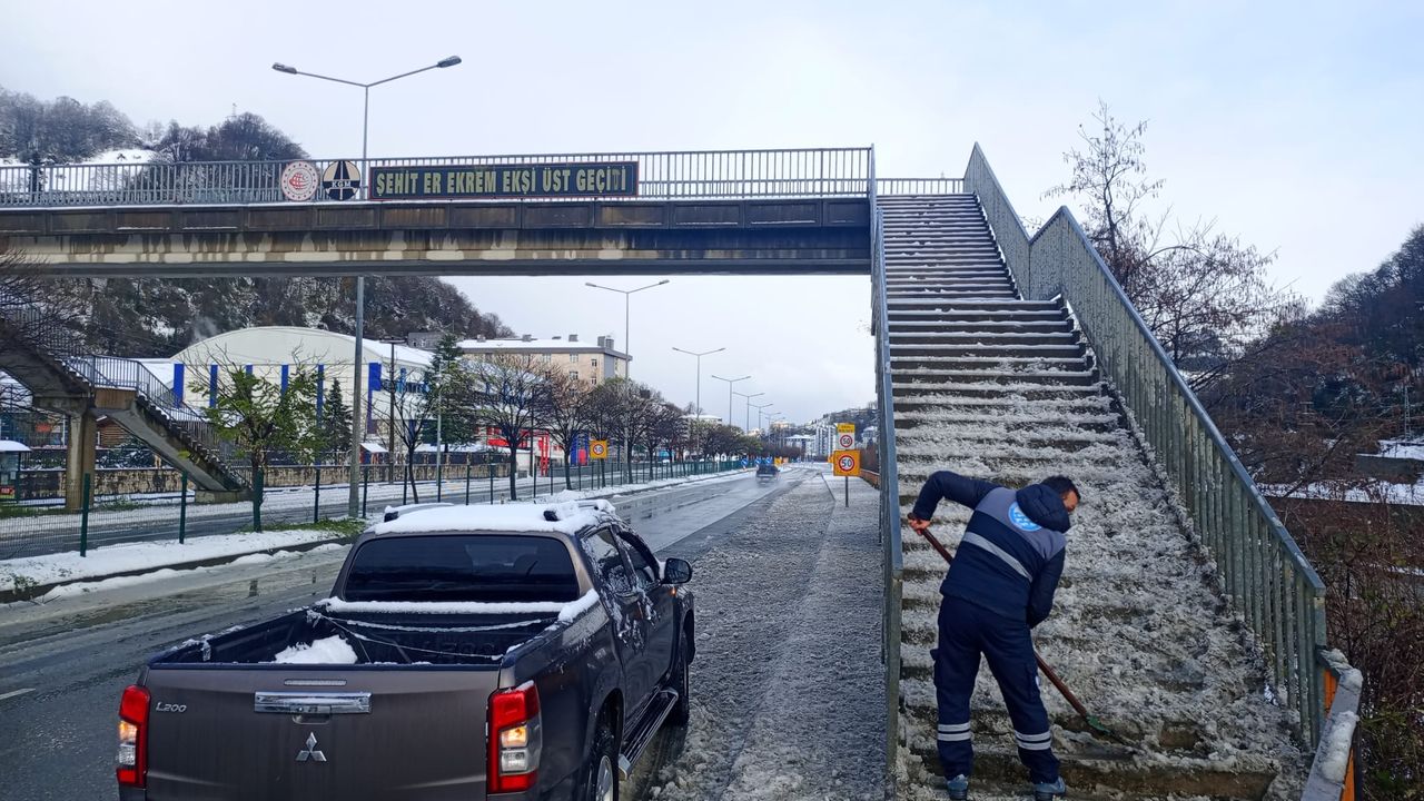 Trabzon Büyükşehir Belediyesi ekipleri, gece etkili olan kar yağışının ardından şehir merkezinde kar temizleme seferberliği başlattı. Günün ilk ışıklarıyla birlikte sahaya çıkan ekipler, yaya ve araç trafiğinin aksamaması için yoğun çaba harcıyor.