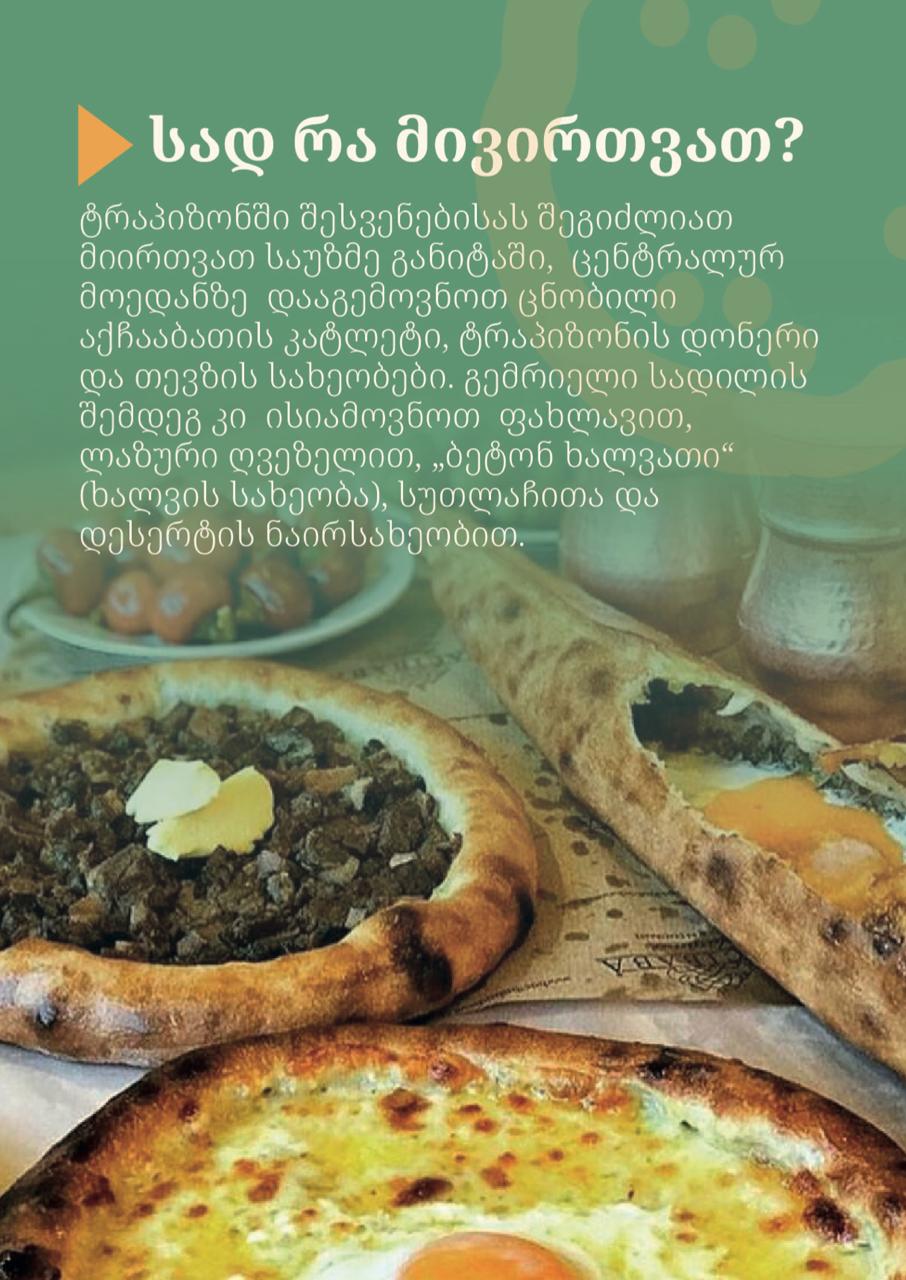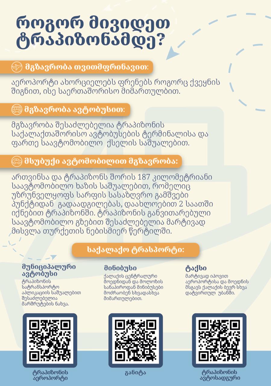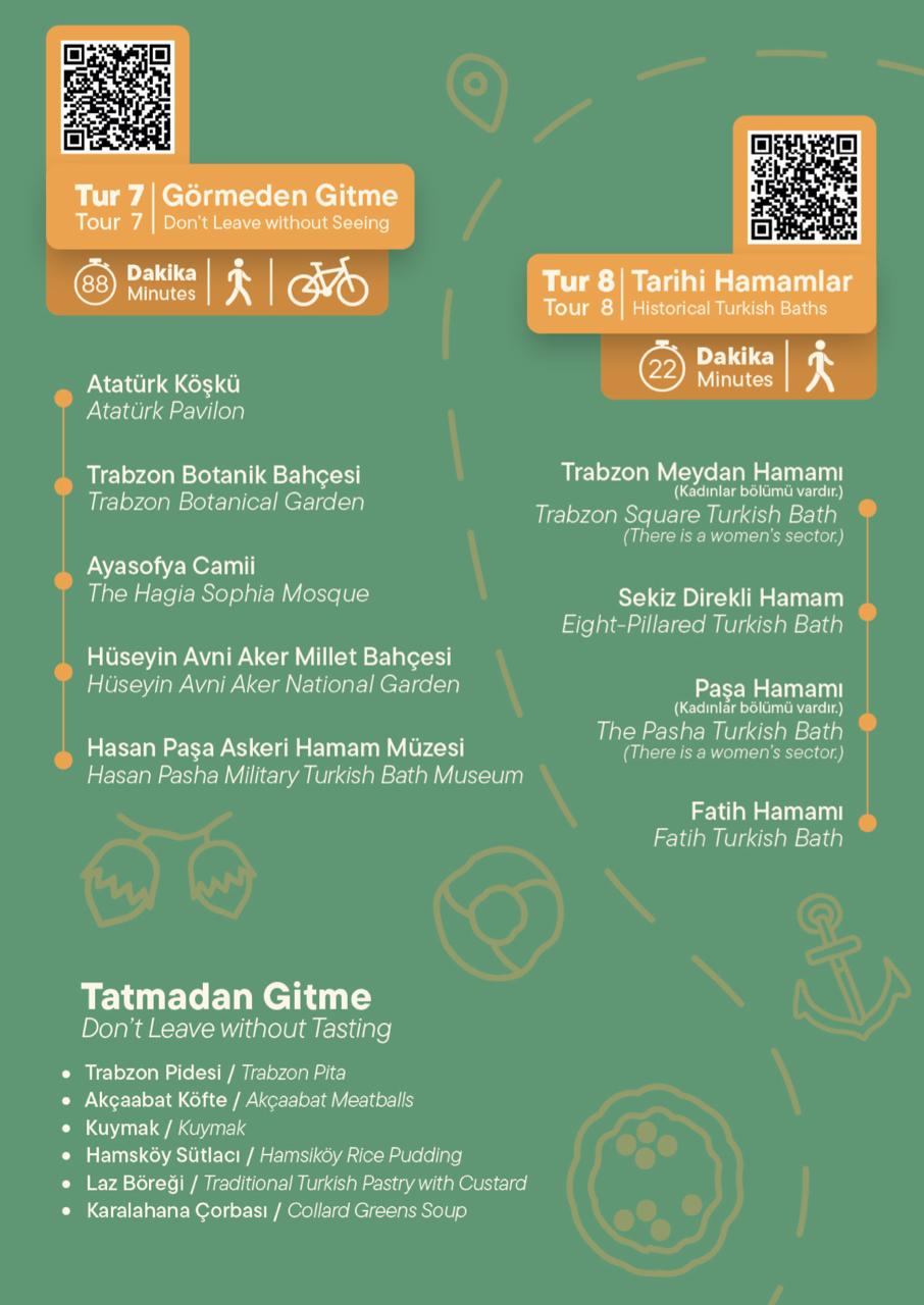 Trabzon Büyükşehir Belediyesi Kültür, Sanat ve Sosyal İşler Dairesi Başkanlığı 'Trabzon’da Bir Mola' adlı cep rehberi hazırladı. İngilizce, Rusça ve Gürcüce hazırlanan rehber, özellikle kruvaziyer gemilerle Trabzon’a gelen turistlerin şehirle ilk temas noktasında bilgiye hızlıca ulaşmalarını hedefliyor. Rehber, Trabzon Limanı’nda gemiden inen turistlere ve uluslararası kapıdan giriş yapan misafirlere dağıtılmaya başlandı. Ayrıca Gürcüce versiyonu, Sarp Sınır Kapısı’ndan giriş yapan ziyaretçilere ulaştırılıyor.