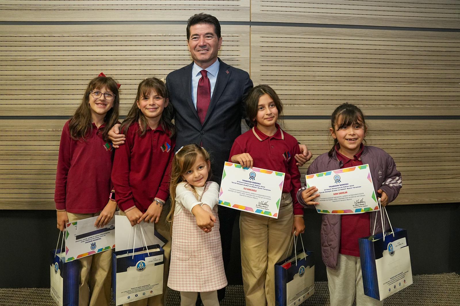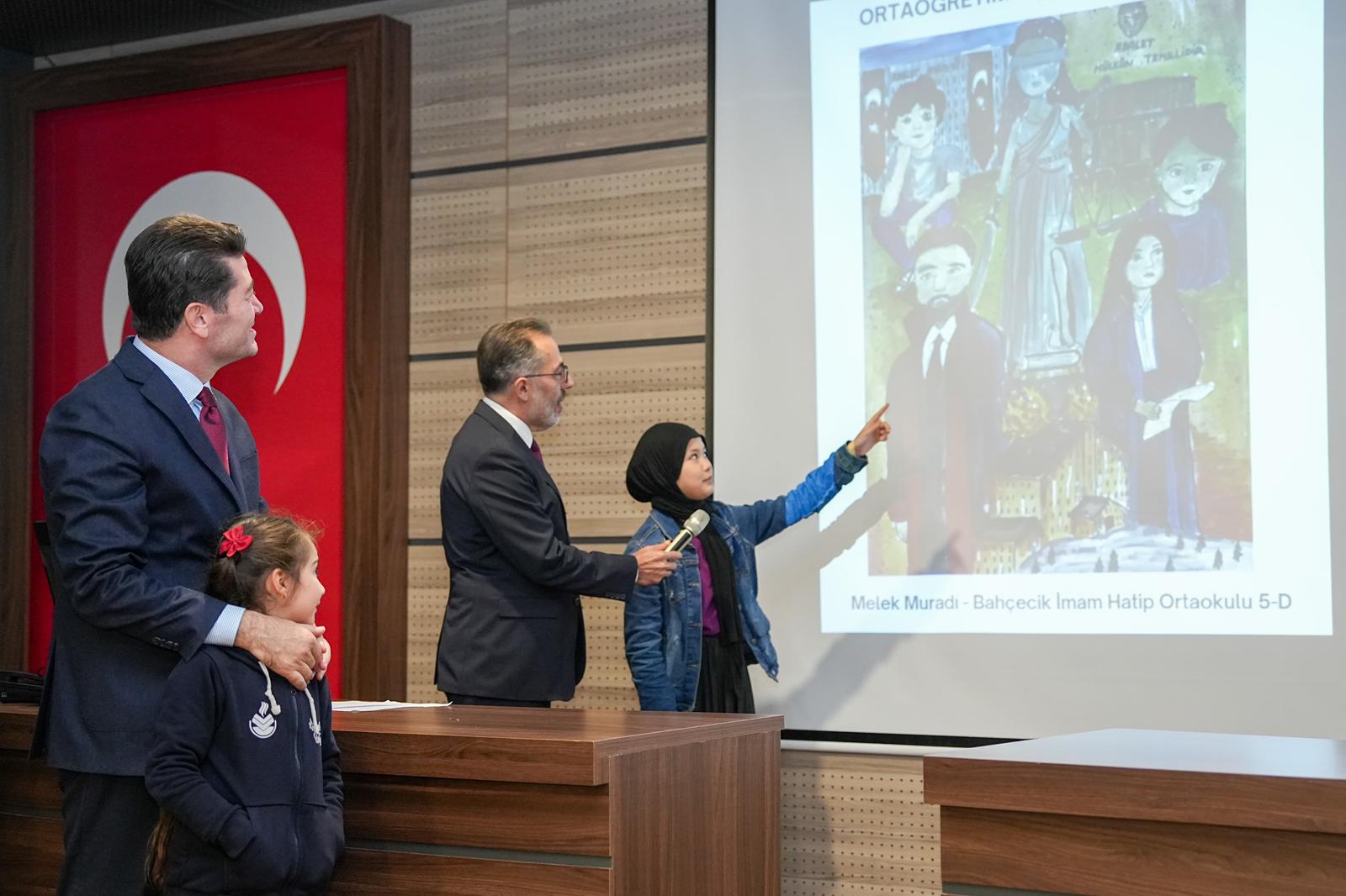 Başkan Kaya, Bahçecik İmam Hatip Ortaokulu ve Özel Karadeniz İlkokulu’ndan 3.’lük derecelerini alan Melek Muradı ile Ülkü Yılmaz’a ödüllerini verdi. Sahneye çıkan öğrenciler tebrik edilirken, çocukların eserlerinden oluşan resim sergisi de törenin ardından katılımcıların beğenisine sunuldu. Çocukların hayal dünyasını yansıtan ‘adalet’ konulu eserler katılımcılardan tam not aldı.