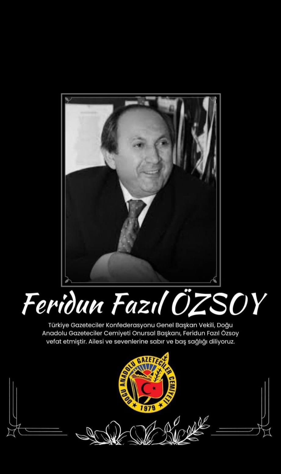 Türkiye Gazeteciler Konfederasyonu Genel Başkan Vekilliği, Doğu Anadolu Gazeteciler Federasyonu Genel Başkanlığı ve Doğu Anadolu Gazeteciler Cemiyeti Başkanlığı görevlerinde bulunan gazeteci Feridun Fazıl Özsoy, hayatını kaybetti.