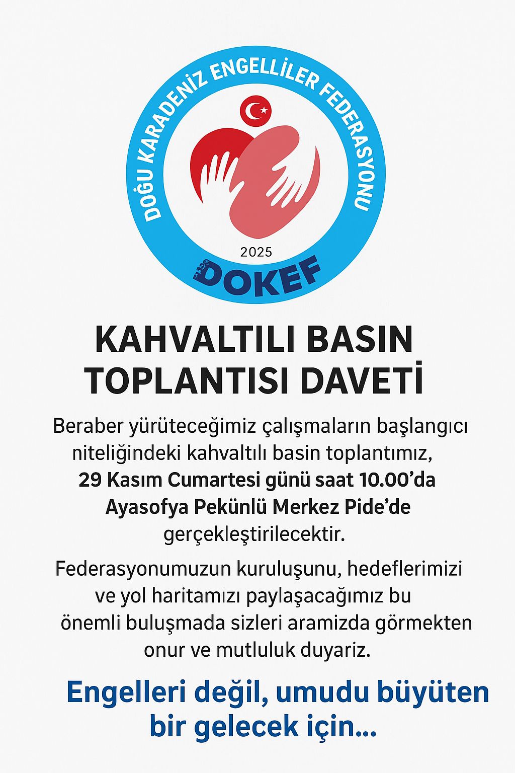 29 Kasım Cumartesi günü saat 10.00'da Ayasofya Pekünlü Merkez Pide'de gerçekleştirilecek olan buluşma, DOKEF'in bölgedeki engelli bireylere yönelik çalışmalarının başlangıcı niteliğini taşıyor.