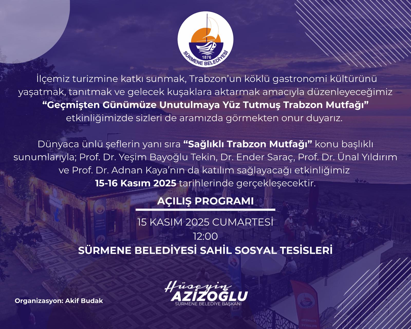 Sürmene Belediyesi tarafından, ilçemiz turizmine katkı sunmak, Trabzon'un köklü gastronomi kültürünü yaşatmak, tanıtmak ve gelecek kuşaklara aktarmak amacıyla "Geçmişten Günümüze Unutulmaya Yüz Tutmuş Trabzon Mutfağı" etkinliği düzenleniyor.
