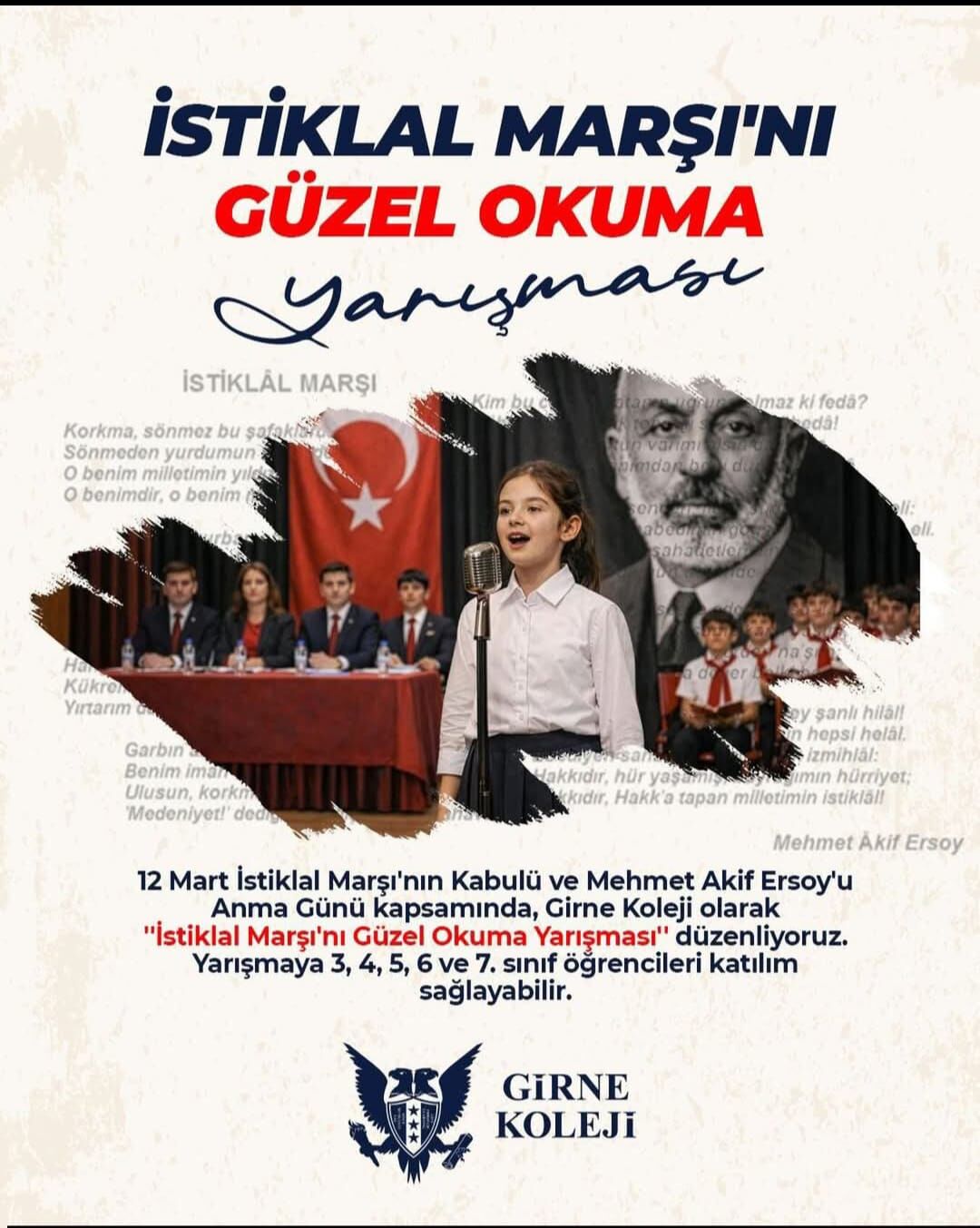 12 Mart İstiklal Marşı’nın Kabulü ve Mehmet Akif Ersoy’u Anma Günü kapsamında, Trabzon Girne Koleji kampüsleri arasında düzenlenen “İstiklal Marşını Güzel Okuma Yarışması”nda öğrencilerimiz, millî değerlerimize olan sevgilerini ve sanatsal yeteneklerini sahnede sergileyecek.