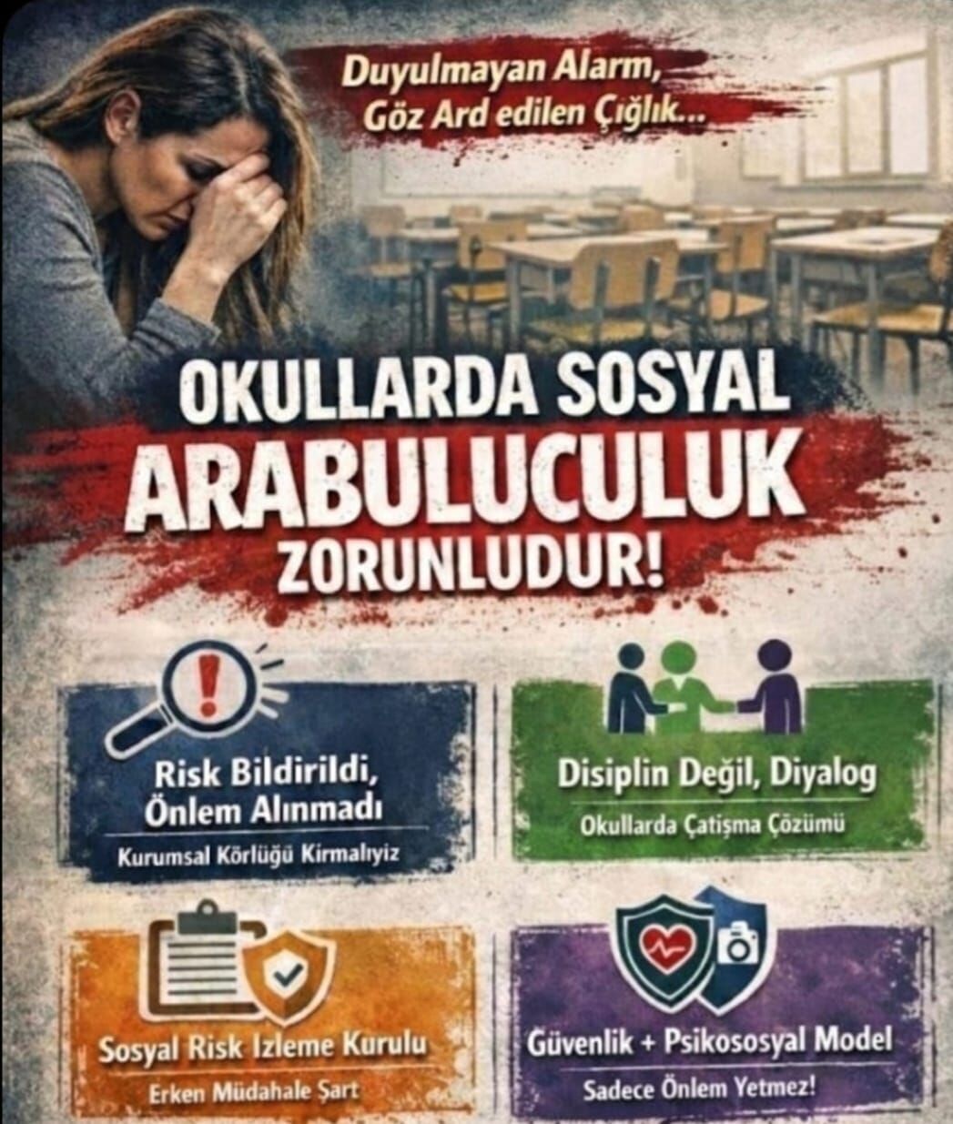 Okullarda son dönemde yaşanan bıçaklı ve silahlı şiddet olaylarına da dikkat çeken Adem Solak" Okullar da koruyucu- önleyici tedbirler şart. İş işten geçtikten sonra cezayı verip takip etsen ne olacak? Mesele bela geliyorum derken takip edip gereğini yapabilmektir.
