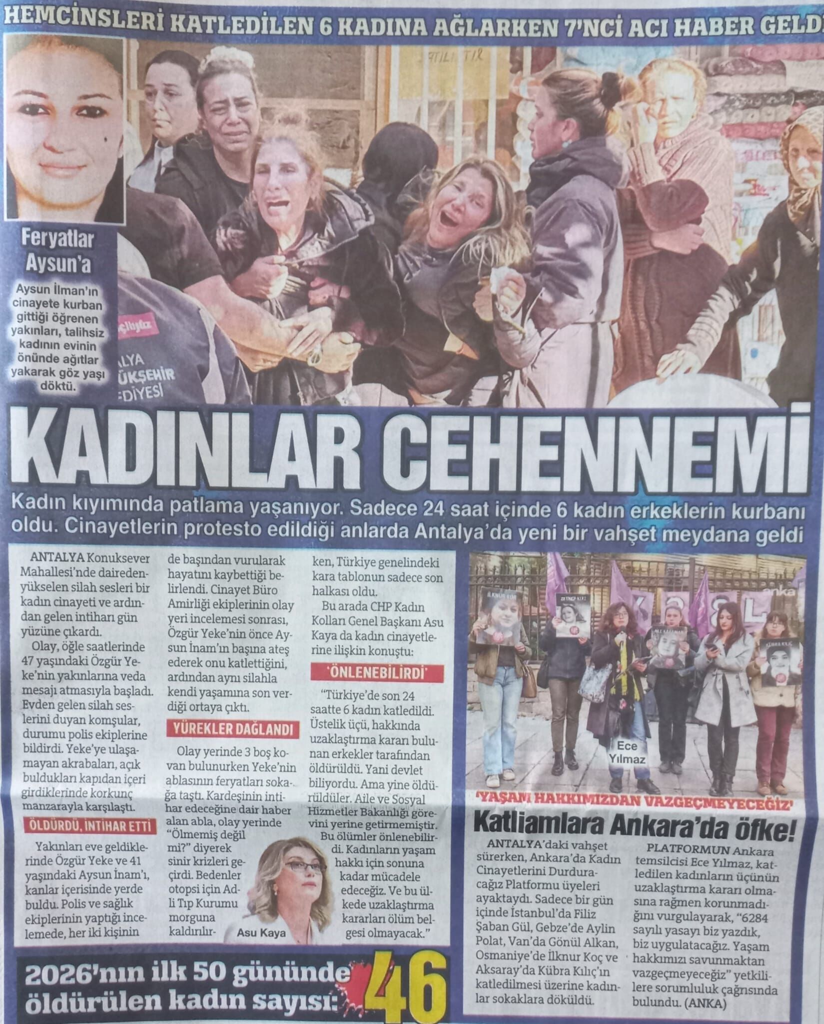 Hemen hemen her gün yaşanan kadın cinayeti ve şiddet vakalarının önüne geçilemiyor. Önceki gün sadece 24 saat içinde 6 kadının cinayete kurban gittiği ülkemizde son bir buçuk ayda 75 kadın eşleri yada eski erkek arkadaşları tarafından öldürüldü..