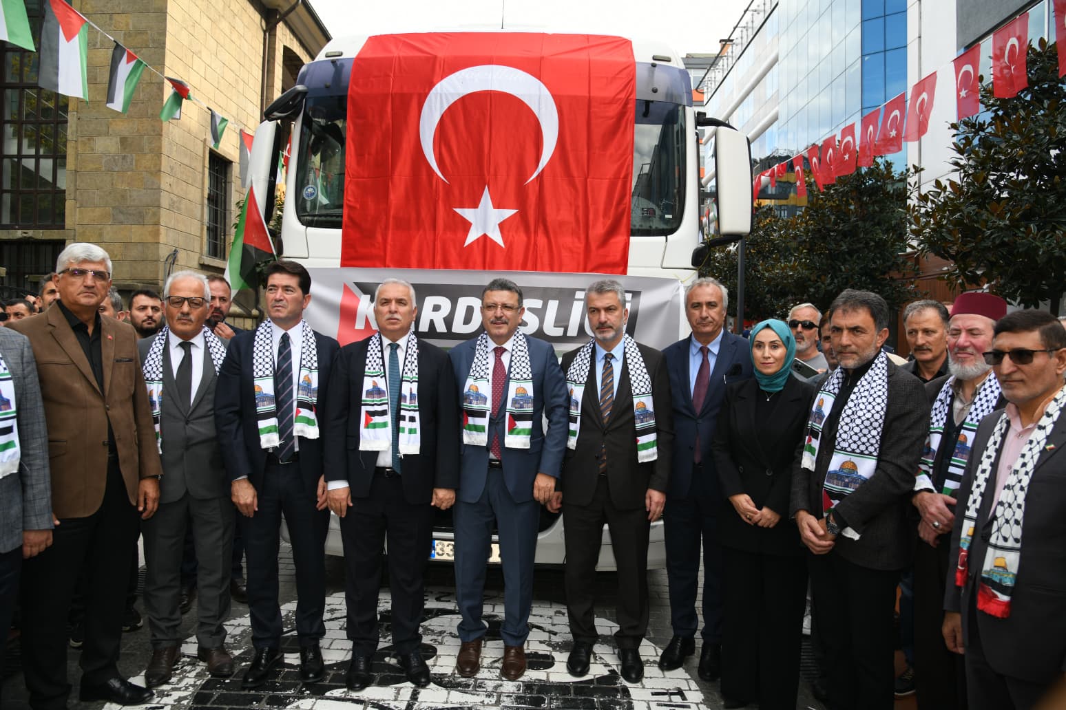 Trabzon Büyükşehir Belediyesi, Hayrat İnsani Yardım Derneği ve İl Milli Eğitim Müdürlüğü iş birliğiyle toplanan 250 ton insani yardım malzemesi, 10 TIR'dan oluşan konvoyla Gazze'ye ulaştırılmak üzere yola çıktı. Kahramanmaraş Caddesi'nde düzenlenen yardım konvoyunu uğurlama törenine, Vali Aziz Yıldırım, Büyükşehir Belediye Başkanı Ahmet Metin Genç ve Hayrat İnsani Yardım Derneği yöneticilerinin yanı sıra, ilçe belediye başkanları, siyasi parti ve sivil toplum kuruluşlarının temsilcileri, kurum müdürleri, öğrenciler ile çok sayıda vatandaş katıldı.