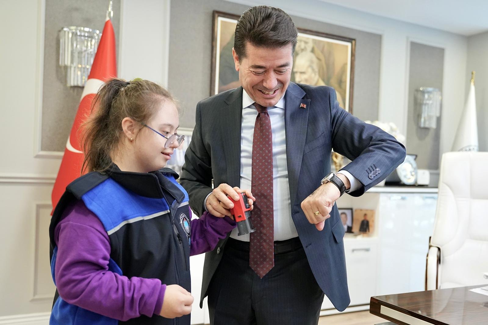 Down sendromlu 8 öğrenci, belediye hizmet birimlerini gezerek çalışmalara katıldı, zabıta kıyafeti giyerek denetimlerde bulundu. Belediye Başkanı Ahmet Kaya, “Özel çocuklarımızın hayatın her kademesinde aktif bir şekilde yer almasını çok önemsiyoruz. Bu amaçla özel çocuklarımızın hoşça vakit geçirebileceği mola evi mahiyetindeki parkımızı 30 Mart Pazartesi günü hizmete açacağız” dedi.