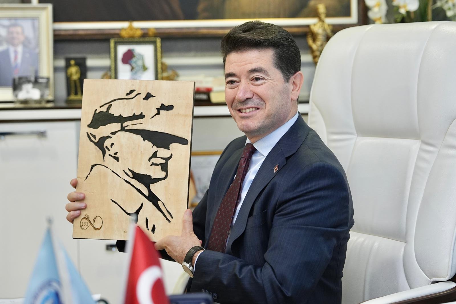 Öğrencileri iltifatlarla karşılayan Başkan Kaya, her birine ayrı ayrı ‘hoş geldiniz’ dedi, atölyede yaptıkları Atatürk tablosu hediyesi için teşekkür etti.