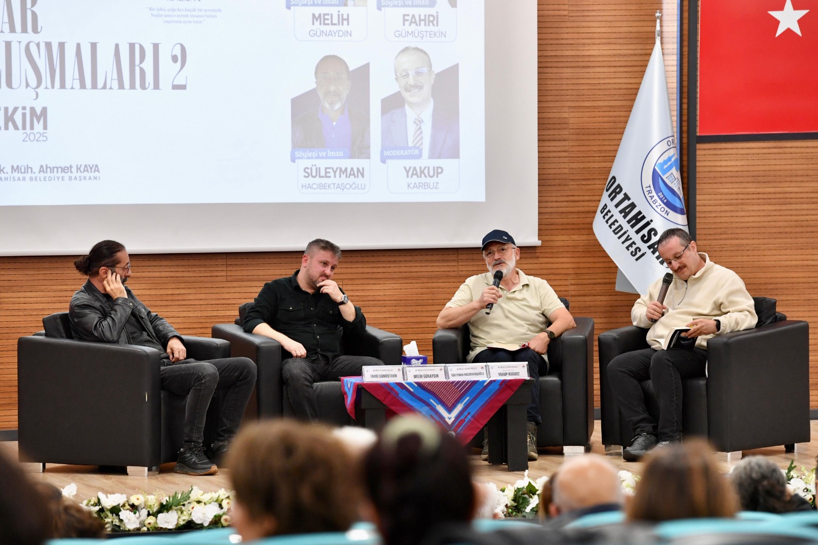 Günün ilk söyleşisinde, Trabzonlu yazarlar Süleyman Hacıbektaşoğlu, Melih Günaydın ve Fahri Gümüştekin, Yakup Karbuz’un moderatörlüğünde dinleyicilerle buluştu. Konuşmasında Ortahisar Belediyesi’ne kendilerine gösterilen misafirperverlikten ötürü teşekkür eden Yazar Günaydın, polisiye türünde çıkardığı romanlardan bahsetti.