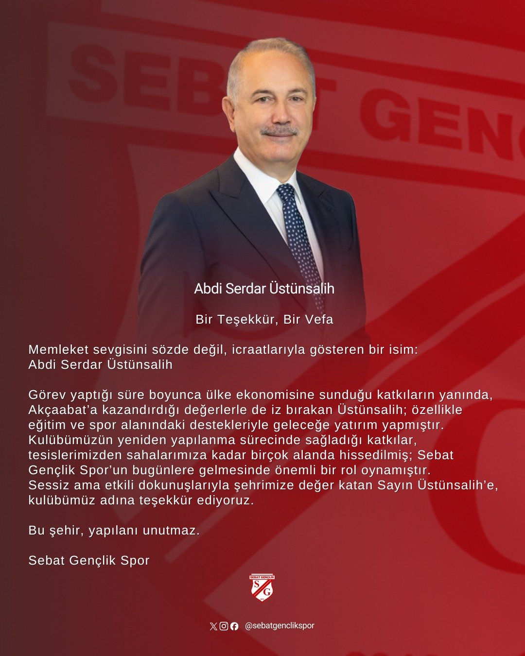 Görev yaptığı süre boyunca ülke ekonomisine sunduğu katkıların yanında, Akçaabat’a kazandırdığı değerlerle de iz bırakan Üstünsalih; özellikle eğitim ve spor alanındaki destekleriyle geleceğe yatırım yapmıştır. Kulübümüzün yeniden yapılanma sürecinde sağladığı katkılar, tesislerimizden sahalarımıza kadar birçok alanda hissedilmiş; Sebat Gençlik Spor’un bugünlere gelmesinde önemli bir rol oynamıştır. Sessiz ama etkili dokunuşlarıyla şehrimize değer katan Sayın Üstünsalih’e, kulübümüz adına teşekkür ediyoruz.