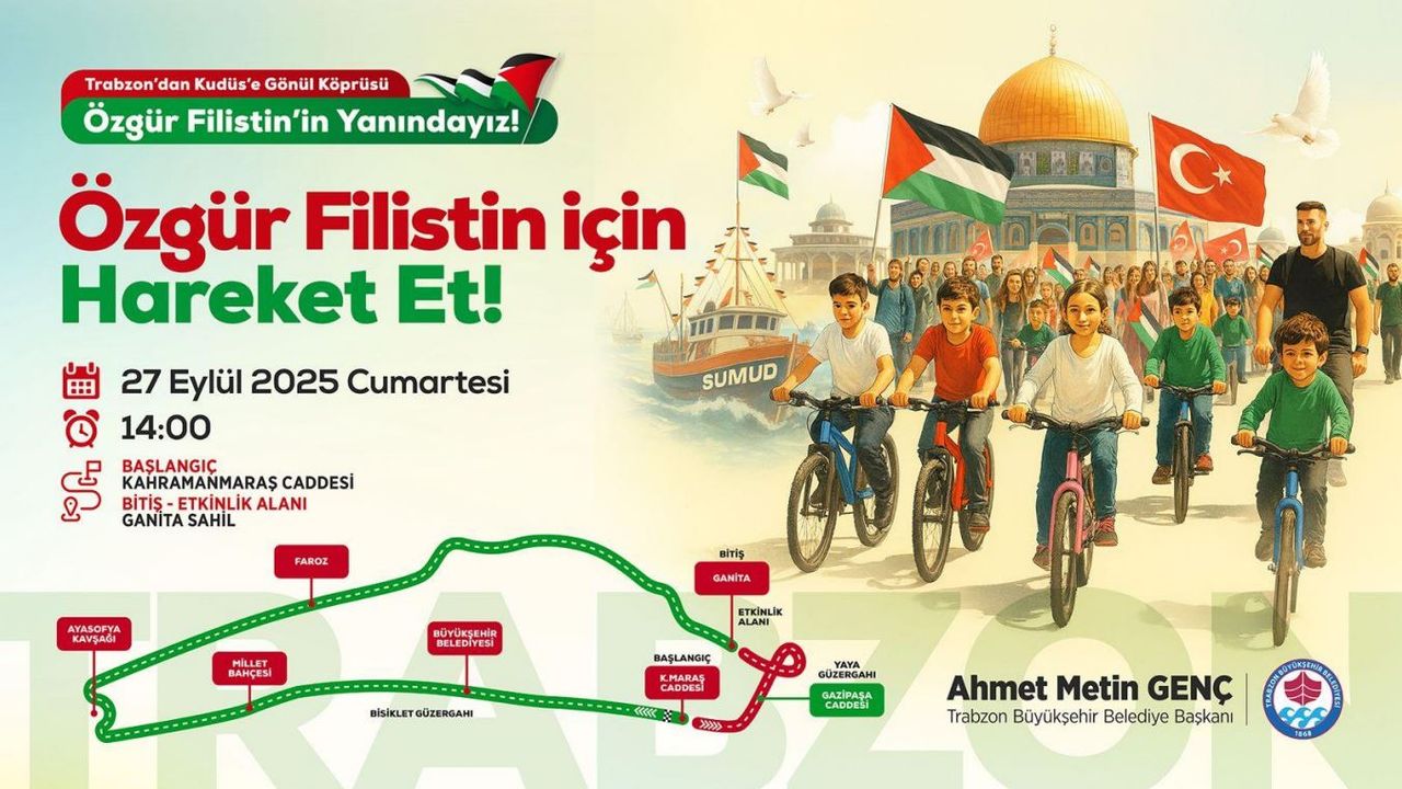Trabzon Büyükşehir Belediyesi Ulaştırma Dairesi Başkanlığı, Gazze’ye yönelik ablukanın kaldırılmasına dikkat çekmek ve uluslararası SUMUT yardım gemilerine destek vermek amacıyla “Trabzon’dan Kudüs’e Gönül Köprüsü” adıyla etkinlik düzenleyecek. “Özgür Filistin İçin Hareket Et!” sloganıyla gerçekleştirilecek etkinlik, 27 Eylül 2025 Cumartesi günü saat 14.00’te başlayacak. Program kapsamında bisiklet turu, yürüyüş ve çeşitli sportif aktiviteler yapılacak. Yaklaşık 10 kilometrelik bisiklet turu Kahramanmaraş Caddesi Ziraat Bankası önünden start alacak. Katılımcılar Trabzon Büyükşehir Belediyesi önü, Ayasofya Kavşağı, sahil bisiklet yolu ve tenis kortları güzergahını takip ederek Ganita Sahili’ne ulaşacak. Parkur üzerinde dinlenme noktaları oluşturulacak.