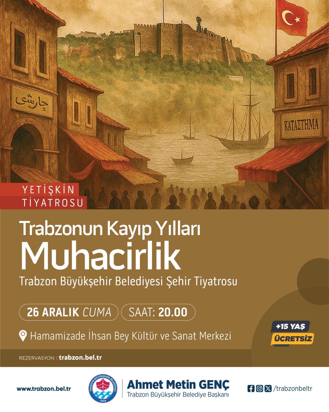 26 Aralık Cuma günü saat 20.00’de Trabzon Büyükşehir Belediyesi Şehir Tiyatrosu “Trabzon’un Kayıkçı Yılları: Muhacirlik” adlı oyunla sahne alacak. 27 Aralık Cumartesi saat 14.00’te “Pinokyo”, aynı gün saat 20.00’de ise Yenilmez Tiyatrosu’nun “Korkma” adlı yetişkin oyunu izleyiciyle buluşacak. Ayın son tiyatro etkinliği 28 Aralık Pazar günü saat 14.00’te Panki Sahne Sanatları’nın “Keloğlan’ın Altınları” adlı çocuk oyunu olacak.