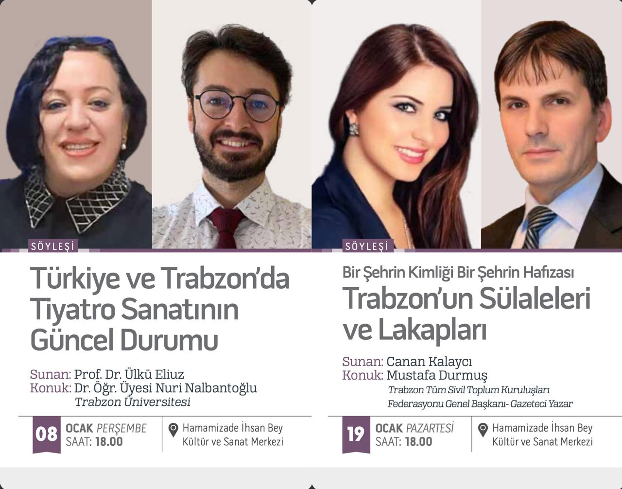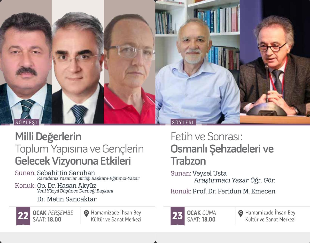22 Ocak Perşembe günü saat 18.00’da Karadeniz Yazarlar Birliği Başkanı Sebahattin Saruhan’ın sunumuyla, Yeni Yüzyıl Düşünce Derneği Başkanı Op. Dr. Hasan Akyüz’ün katılacağı “Milli Değerlerin Toplum Yapısına ve Gençlerin Gelecek Vizyonuna Etkileri” konulu söyleşi yapılacak. 23 Ocak Cuma günü saat 18.00’da Araştırmacı-Yazar ve Öğretim Görevlisi Veysel Usta’nın sunumuyla, Prof. Dr. Feridun M. Emecen’in konuk olacağı “Fetih ve Sonrası: Osmanlı Şehzadeleri ve Trabzon” konulu söyleşi gerçekleştirilecek.