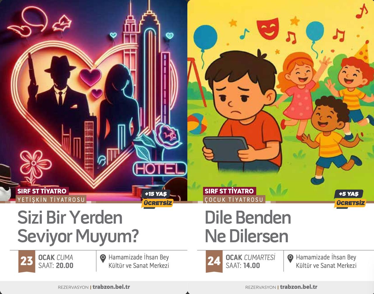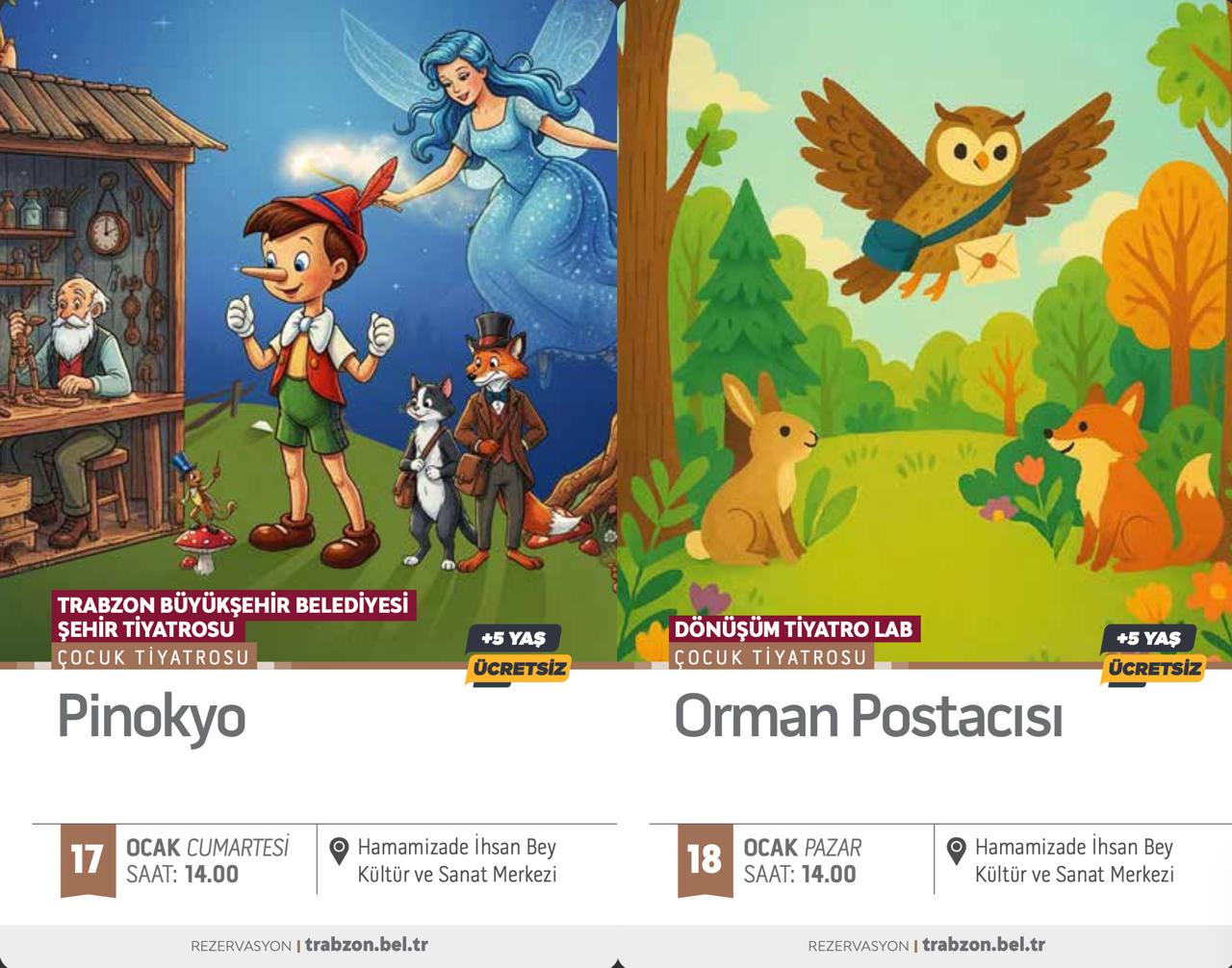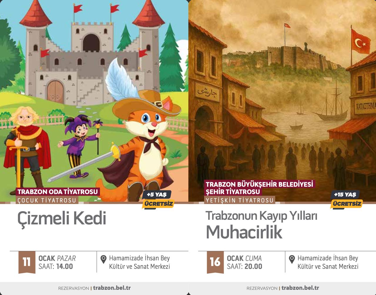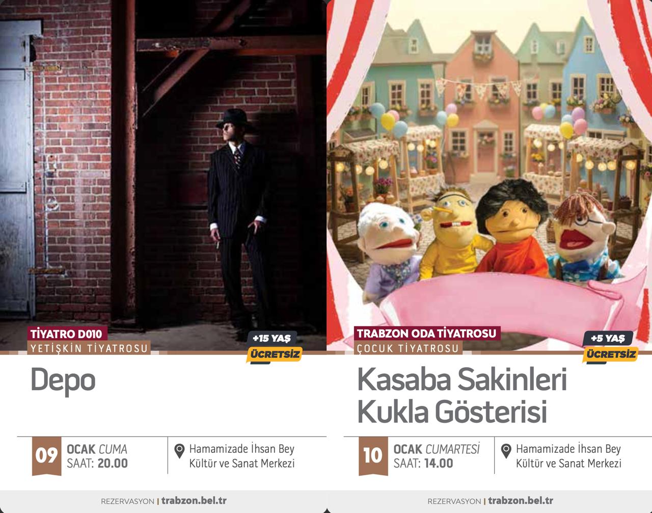 Hamamizade İhsan Bey Kültür ve Sanat Merkezi’nde gerçekleştirilecek program kapsamında 9 Ocak Cuma günü saat 20.00’de yetişkinlere yönelik “Depo” adlı tiyatro oyunu sahnelenecek. 10 Ocak Cumartesi günü saat 14.00’te “Kasaba Sakinleri” adlı kukla gösterisi çocuklarla buluşacak. 11 Ocak Pazar günü saat 14.00’te “Çizmeli Kedi” adlı çocuk tiyatrosu sahne alacak. 16 Ocak Cuma günü saat 20.00’da Trabzon Büyükşehir Belediyesi Şehir Tiyatrosu tarafından sahnelenecek “Trabzon’un Kayıp Yılları: Muhacirlik” adlı oyun izleyiciyle buluşacak.