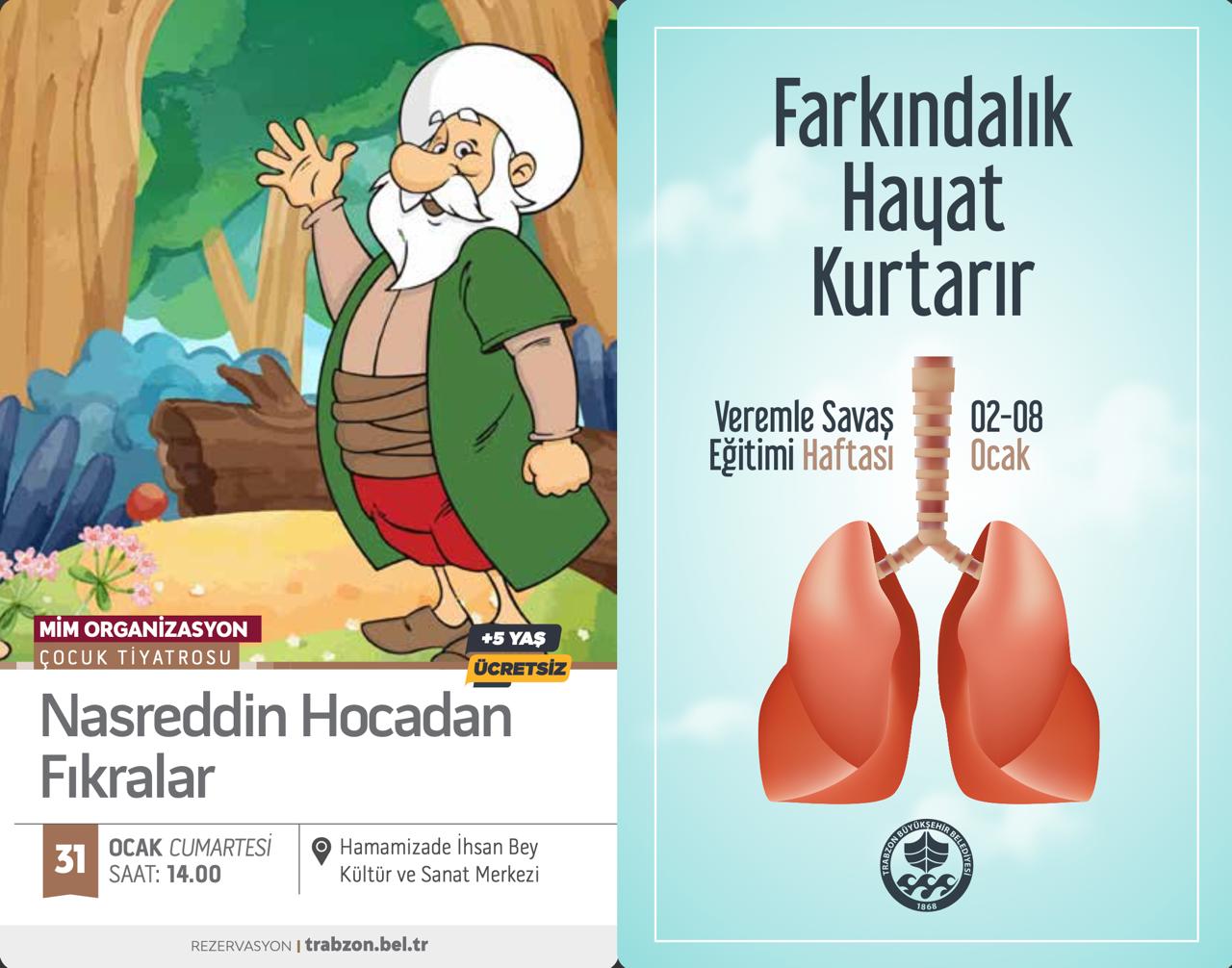 Trabzon Büyükşehir Belediyesi, Ocak ayı boyunca kültür ve sanat etkinlikleri düzenleyecek. Büyükşehir Belediyesi Kültür, Sanat ve Sosyal İşler Dairesi Başkanlığı tarafından hazırlanan program kapsamında tiyatro oyunları, konserler, söyleşiler ve sergi etkinlikleri vatandaşlarla buluşacak.