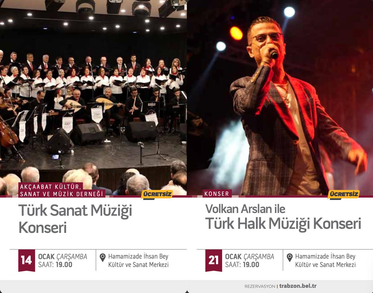 14 Ocak Çarşamba günü saat 19.00’da Akçaabat Kültür, Sanat ve Müzik Derneği tarafından Türk Sanat Müziği Konseri verilecek. 21 Ocak Çarşamba günü saat 19.00’da sanatçı Volkan Arslan’ın sahne alacağı Türk Halk Müziği Konseri düzenlenecek.