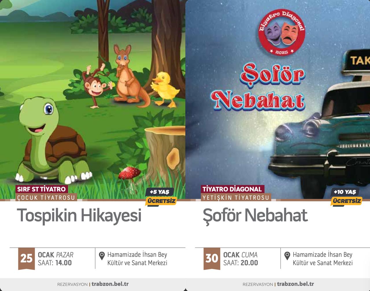 24 Ocak Cumartesi günü saat 14.00’te “Dile Benden Ne İstersen” adlı çocuk tiyatrosu izleyiciyle buluşacak. 25 Ocak Pazar günü saat 14.00’te “Tospik’in Hikayesi” adlı tiyatro gösterisi sahnelenecek. 30 Ocak Cuma günü saat 20.00’de “Şoför Nebahat” adlı yetişkin tiyatro oyunu tiyatroseverlerle buluşacak. 31 Ocak Cumartesi günü saat 14.00’te ise “Nasreddin Hoca’dan Fıkralar” adlı çocuk tiyatrosu sahnelenecek.