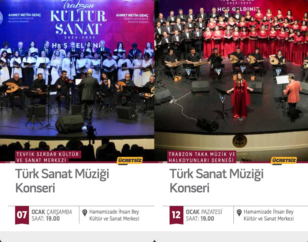 7 Ocak Çarşamba günü saat 19.00’da Tevfik Serdar Kültür ve Sanat Merkezi tarafından Türk Sanat Müziği Konseri düzenlenecek. 12 Ocak Pazartesi günü saat 19.00’da Trabzon Taka Müzik ve Halkoyunları Derneği tarafından Türk Sanat Müziği Konseri sanatseverlerin beğenisine sunulacak.