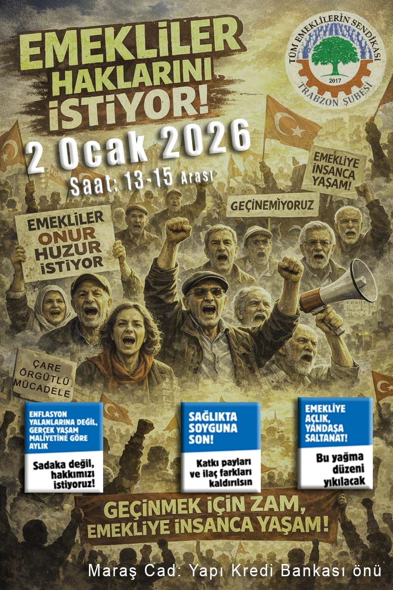 Açıklamada, “Tüm Emeklilerin Sendikası Trabzon Şubesi olarak tüm halkımızın yeni yılını kutlarken, emekliye açlık, yandaşa saltanat! Bu yağma düzenini değiştirmek için tüm halkımızı 2 Ocak 2026 günü yapacağımız basın açıklamasına davet ediyoruz.” ifadelerine yer verildi.